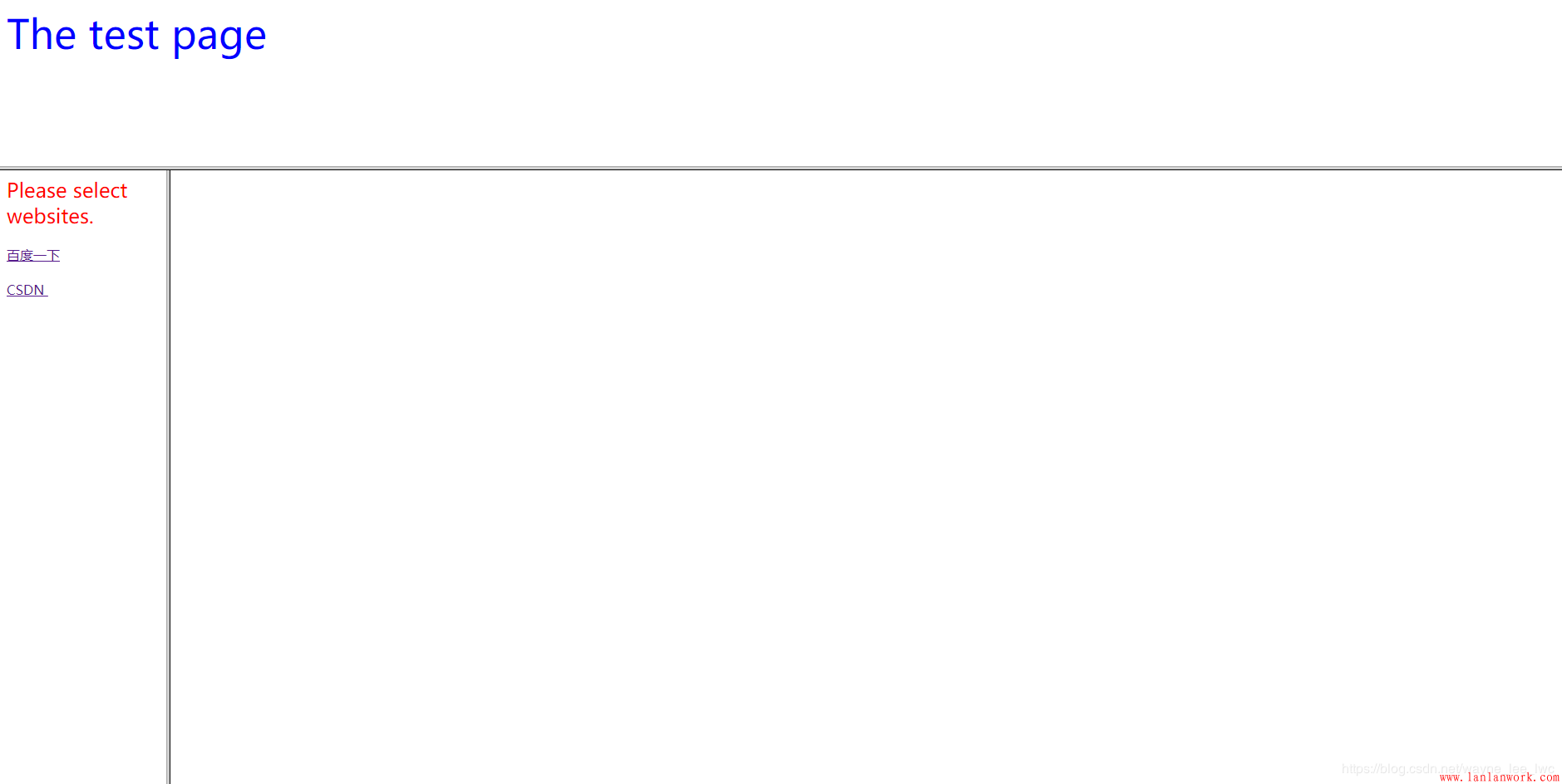 <html> <head></head> <frameset rows="500,*" border="3" noresize="noresize"> </frame> </html>看上面的代碼,用frameset替換掉body不難理解,畢竟我們約定做框架的網(wǎng)頁不具有實(shí)體內(nèi)容 接著,這里提到了框架標(biāo)簽的三個(gè)屬性,分別為: rows/cols 框架的分行或分列 border 分隔框的寬度 noresize 大小是否可調(diào) 現(xiàn)在來分別解釋一下 第一個(gè),rows 或cols 屬性,代表了框架的分行或分列的情況,在引號內(nèi)書寫該屬性的值的時(shí)候,不需要指明分成幾欄,只需要指明每一欄占據(jù)的寬度或高度(單位為像素)并使用逗號隔開。瀏覽器在解析的時(shí)候會計(jì)算到底分成了幾欄。另外,不指定寬度而使其占據(jù)剩余位置時(shí),可以使用通配符 “ * ”。 第二個(gè),border 屬性,代表了分隔框的寬度,這是屬性的數(shù)值單位是像素。所以如果你不想加入邊框,則可以將它設(shè)置為零。 第三個(gè),noresize 屬性,表示我們的框架的大小是否可調(diào),frameset標(biāo)簽?zāi)J(rèn)為大小可調(diào),當(dāng)用戶鼠標(biāo)移動到邊框上時(shí),他可以拖拽改變大小。所以如果不想讓用戶隨意改變框架大小,那么可以選擇使用這個(gè)屬性 (當(dāng)然,也可以選擇把邊框的寬度設(shè)為零,讓他找不到)。 這個(gè)屬性的值同屬性名稱一樣。 最后還需要說明的是:框架集標(biāo)簽是可以進(jìn)行嵌套的,也就是說,在已經(jīng)分出來的框架中,我們可以借著分欄。 在框架內(nèi)鑲嵌網(wǎng)頁 剛剛我們使用 frameset 標(biāo)簽將網(wǎng)頁變成框架并劃分成了若干區(qū)域,每一個(gè)區(qū)域都是一個(gè)單獨(dú)的可顯示頁面的子網(wǎng)頁(筆者起的名)?,F(xiàn)在,我們需要在這些區(qū)域內(nèi)為它鑲嵌上一個(gè)網(wǎng)頁,這需要用到frame這個(gè)單標(biāo)簽在框架下添加網(wǎng)頁,它的寫法如下: <frame src="...." name="...." /> 1 這里可以看到 frame 標(biāo)簽的兩個(gè)屬性; src 和 name 。它們分別代表著添置連接(這是一個(gè)超鏈接,網(wǎng)頁,HTML文件,圖片等都是可以的。有關(guān)超鏈接的信息,可參照上一篇學(xué)習(xí)總結(jié)或者問問度娘 ),以及框架名稱。 框架的命名,很主要的一個(gè)原因在于可以重復(fù)利用一個(gè)框架,即在其他標(biāo)簽使用時(shí),可以在某個(gè)框架上顯示相應(yīng)內(nèi)容。還記得上一篇中,我們提到的鏈接標(biāo)簽 target 屬性中的 “某框架名稱” 這個(gè)值嗎?在為框架命名后,就可以使用上述的 target 用法,將打開的網(wǎng)頁放在某個(gè)框架中了。 綜上,舉個(gè)例子: 先來創(chuàng)造一個(gè)帶有嵌套的框架<!--frame--> <html> <head></head> <frameset rows="200,*" border="5" noresize="noresize"> <frame src="title.html" name="title" /> <frameset cols="200,*"> <frame src="selection_bar.html" /> <frame name="output_page" /> </frameset> </frameset> </html><!--title--> <html> <head></head> <body> <font size="7" color="blue"> The test page </font> </body> </html>