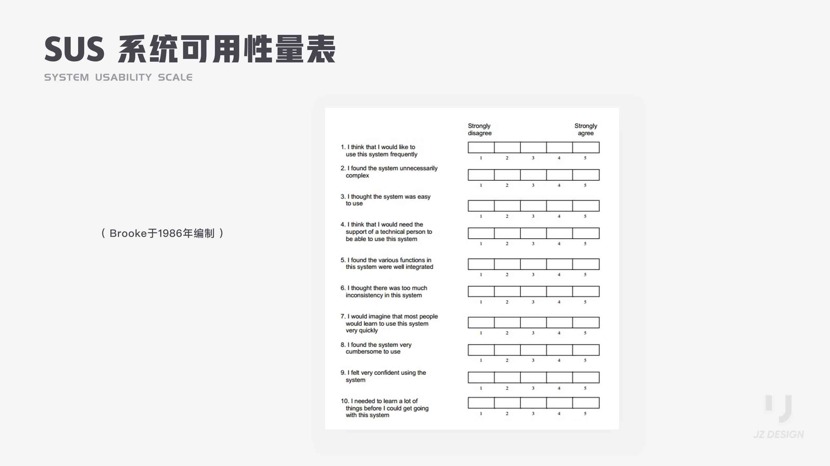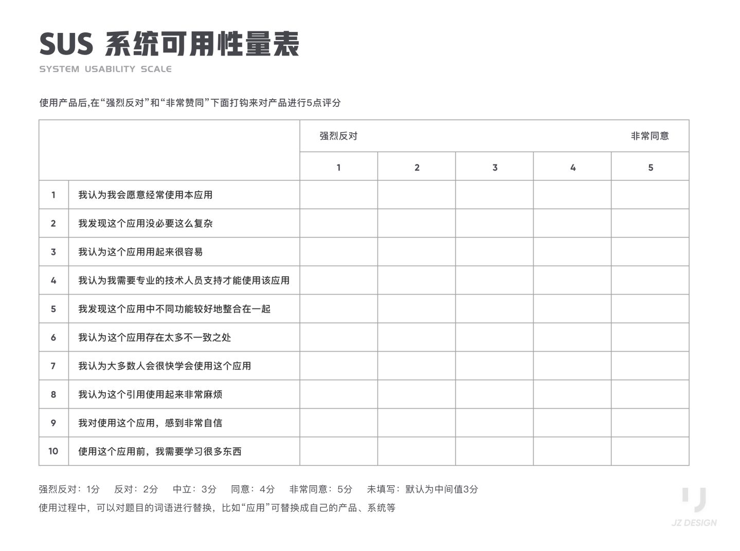 SUS 全稱 System Usability Scale ,系統(tǒng)可用性量表。SUS最初是Brooke于1986年編制,可以科學(xué)地量化用戶體驗(yàn),用于完成一系列任務(wù)場(chǎng)景后,對(duì)產(chǎn)品或系統(tǒng)整體宏觀的感知可用性測(cè)量。