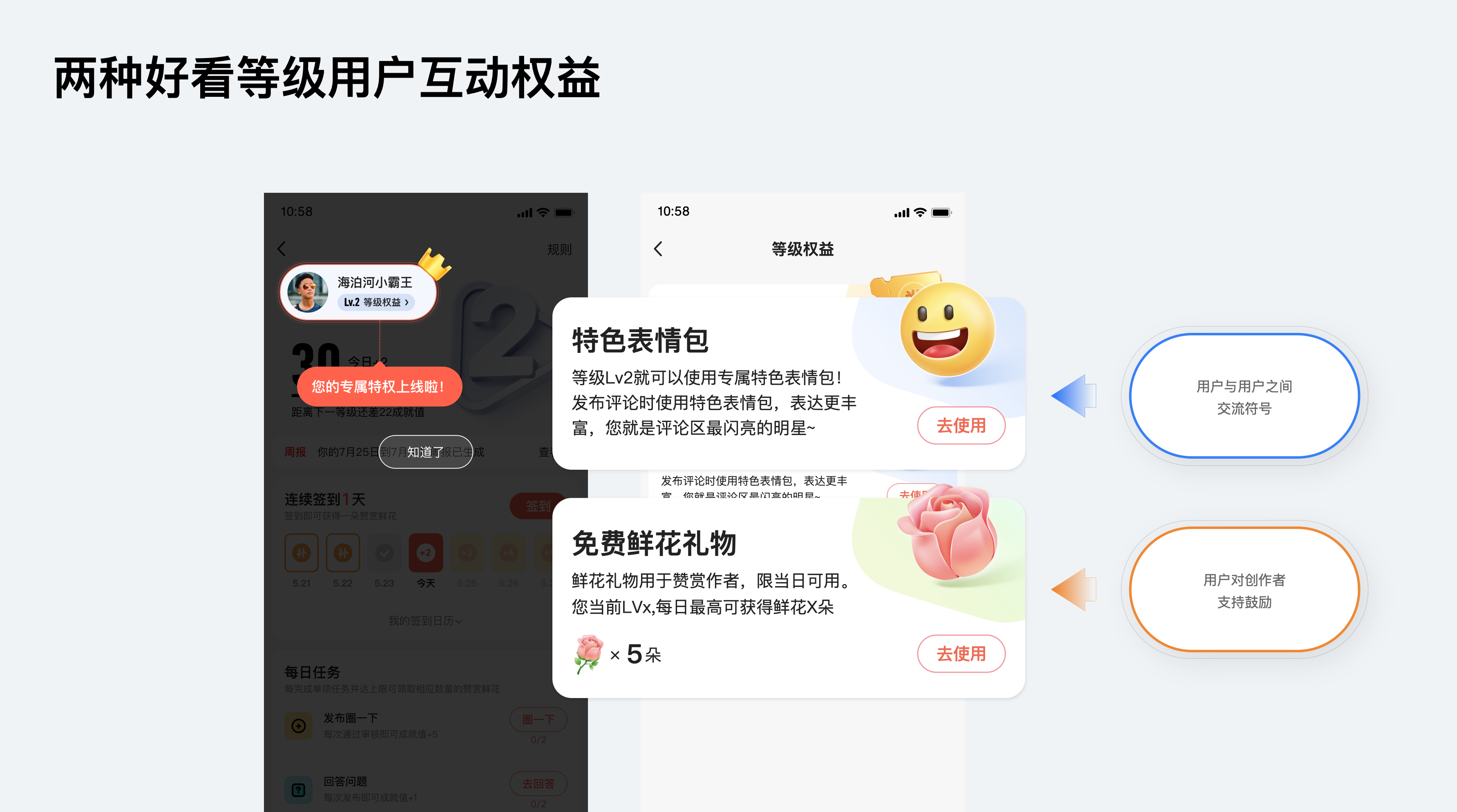 鮮花禮物特權(quán)方面:當(dāng)用戶升級(jí)及完成任務(wù)的同時(shí)可領(lǐng)取該獎(jiǎng)勵(lì),我們采用用戶比較熟知的“授人鮮花,手有余香”的概念,等級(jí)越高可獲得更多鮮花,越能鼓勵(lì)作者,增進(jìn)了創(chuàng)作者與忠實(shí)粉絲之間的關(guān)系。免費(fèi)禮物是好看視頻的首創(chuàng),雙向促進(jìn)用戶與作者激勵(lì),后續(xù)其他平臺(tái)也進(jìn)行了功能跟進(jìn)。在作者的帶動(dòng)下,當(dāng)用戶想給作者贈(zèng)送鮮花時(shí)為了獲取更多的鮮花,也能導(dǎo)流到任務(wù)系統(tǒng)促進(jìn)等級(jí)任務(wù)的完成。