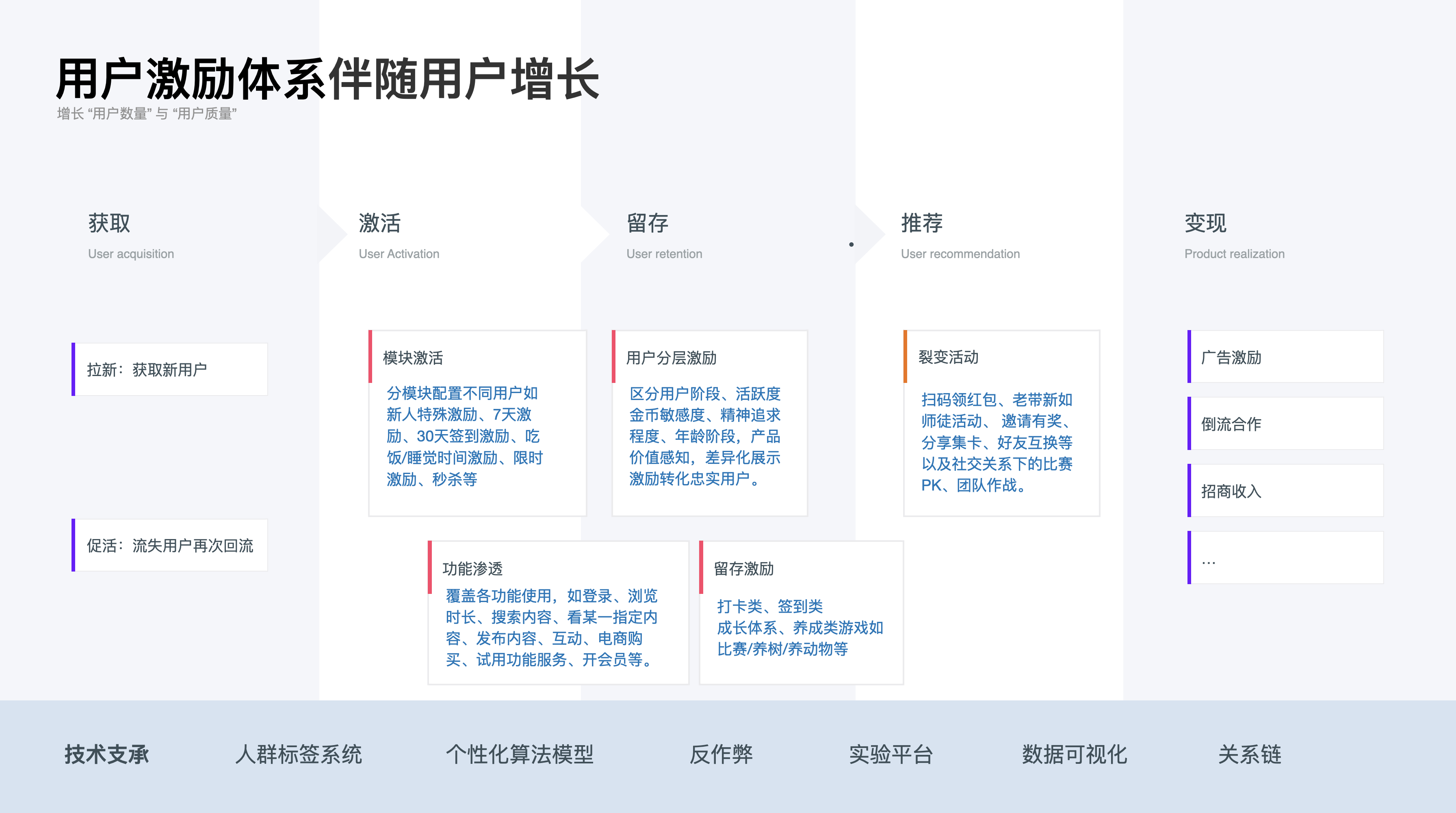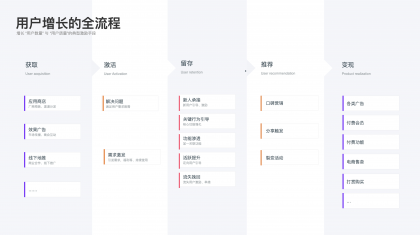 以上是用戶視角下的激勵(lì)體系,下面講講產(chǎn)品業(yè)務(wù)下的激勵(lì)體系的作用,通常情況下激勵(lì)體系伴隨著用戶增長(zhǎng)的全流程“獲取—激活—留存—推薦—變現(xiàn)”各個(gè)過(guò)程。用戶增長(zhǎng)代表著增長(zhǎng)“用戶數(shù)量”與“用戶質(zhì)量”,以上三類激勵(lì)方式都會(huì)在產(chǎn)品增長(zhǎng)的各流程中承擔(dān)著不同程度的促進(jìn)作用: