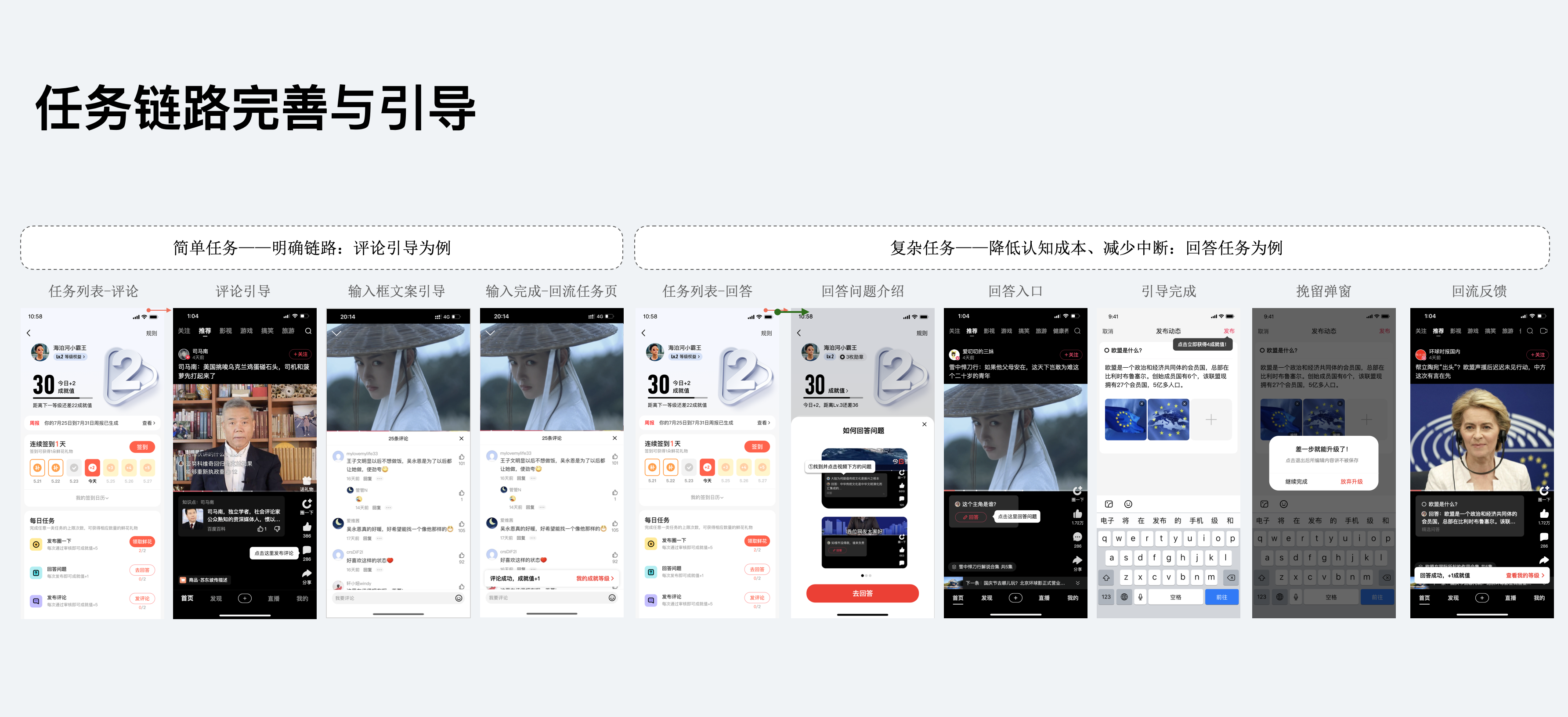 ?首先對(duì)任務(wù)列表排序方面由易到難,保證首屏任務(wù)用戶看起來(lái)更容易完成,同時(shí)任務(wù)支持云端控制,對(duì)不同用戶任務(wù)難易也可以支持配置,其次在任務(wù)鏈路方面,增加了對(duì)于較難任務(wù)的引導(dǎo)介紹,完成任務(wù)的路徑中增進(jìn)引導(dǎo),例如當(dāng)用戶輸入時(shí)輸入框增加默認(rèn)文案引導(dǎo):“發(fā)評(píng)論得成就值”,降低任務(wù)中斷;最后在發(fā)布成功后,反饋告知成就值增加數(shù)量,增加回流提示,方便回到等級(jí)任務(wù)頁(yè)面持續(xù)完成任務(wù)。