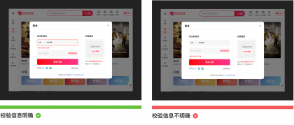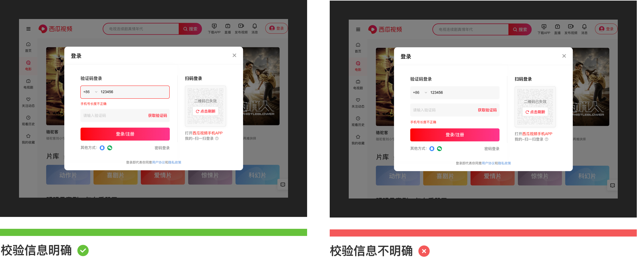 錯(cuò)誤校驗(yàn)提示一般存在于錯(cuò)誤率較高情況下出現(xiàn),如:在登錄注冊(cè)時(shí),要求用戶填寫手機(jī)號(hào),如果用戶輸入的手機(jī)號(hào)碼不符合特定的輸入格式,那么這時(shí)候需要明確標(biāo)記錯(cuò)誤原因,準(zhǔn)確的幫助用戶找到問題并解決,避免錯(cuò)誤提示描述模糊不清誤導(dǎo)用戶。錯(cuò)誤提示一般會(huì)采用“雙重視覺強(qiáng)調(diào)”來顯示錯(cuò)誤,除了輸入框突出顯示外,同時(shí)需要在輸入框下方加入紅色指導(dǎo)文字。如下圖所示為西瓜視頻登錄注冊(cè)場景下的截圖: