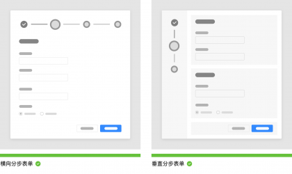 較為復(fù)雜的一類表單,把一個(gè)相對(duì)復(fù)雜的表單字段拆解為多個(gè)步驟進(jìn)行。根據(jù)業(yè)務(wù)屬性進(jìn)行步驟分組利用步驟條告訴用戶所完成的流程和進(jìn)度,當(dāng)用戶每次填寫都意味著一次節(jié)點(diǎn)完成,整個(gè)流程結(jié)束給予明確的結(jié)果反饋,并以提交成功為最終。分布表單有利于減輕用戶由于表單大而復(fù)雜的造成的填寫負(fù)擔(dān),并且能減少用戶表單填寫出錯(cuò)率。
