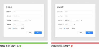 還有一點(diǎn)是表單中視覺噪聲越少可讀性越強(qiáng),因此當(dāng)必填項(xiàng)多于非必填用非必填字段提示用戶會(huì)更好。