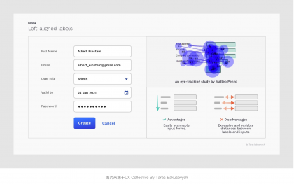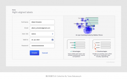將表單標(biāo)簽放置在其對(duì)應(yīng)輸入字段的正上方,并垂直左對(duì)齊排列,用戶只需依次向下瀏覽即可看到標(biāo)簽與輸入字段兩個(gè)元素。其優(yōu)勢(shì)是橫向屏幕空間足夠,能夠比較友好的適配多語言適合非中國區(qū)業(yè)務(wù)表單使用。并且根據(jù)上面Matteo Penzo的時(shí)間表上看,頂部對(duì)齊的瀏覽和填寫的效率也是3種常規(guī)的對(duì)齊方式中較高的一種。不足點(diǎn)是會(huì)占用較多的縱向垂直屏幕空間,此外應(yīng)當(dāng)注意每組表單標(biāo)簽和輸入字段與其他字段組的間距,以免層級(jí)區(qū)分度不夠的問題。