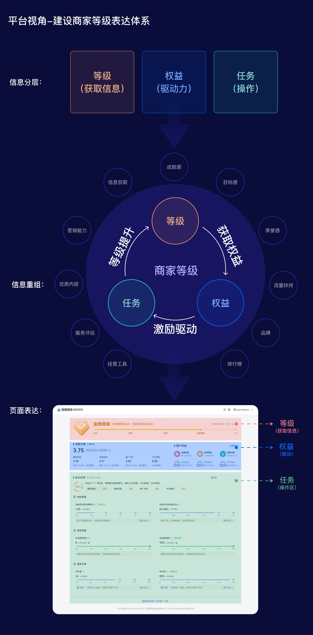 信息分層:開(kāi)始頁(yè)面設(shè)計(jì)之前需要設(shè)計(jì)信息結(jié)構(gòu)和組織方式,以便商家可以輕松找到需要的信息。以商家等級(jí)為例,首先根據(jù)信息價(jià)值將信息分為<等級(jí)-權(quán)益-任務(wù)>三大類(等級(jí)作銜接、權(quán)益提供驅(qū)動(dòng)力、任務(wù)是需完成的動(dòng)作)。