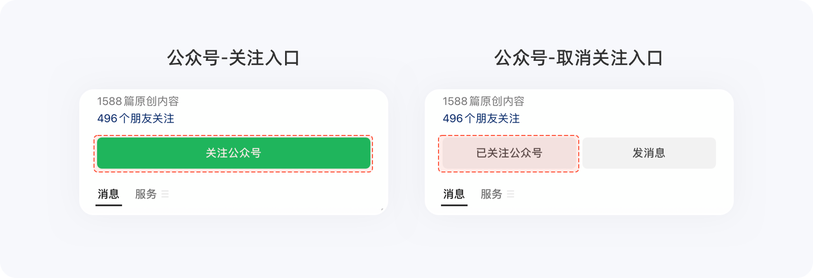 有時候,出于商業(yè)化的目的,同一個選項在二次操作時,產(chǎn)品會刻意增加用戶操作成本,以降低選擇效率,看似希克定律的反向操作,卻一定程度地降低了用戶退出率,實則對產(chǎn)品有益。例如,在關(guān)注微信公眾號之前,非常醒目的關(guān)注按鈕觸手可及,可關(guān)注之后,弱化的幽靈按鈕及文案,很難一眼看出這就是取消關(guān)注入口,需要用戶花費額外的時間去理解或試錯方可取關(guān),這么做能降低公眾號粉絲的取關(guān)量。為公眾號留住粉絲,更是對內(nèi)容認(rèn)可的一種支持,后面的良性循環(huán)無需多講。