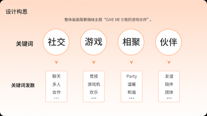 需求方希望畫面能展現(xiàn)出品牌的社交感,以“游戲伙伴”為主題,畫面表達(dá)各種不同類型游戲伙伴,因我們的產(chǎn)品而相聚的場(chǎng)景。同時(shí)希望畫面中的人物能做出擊掌(GIVE ME 5)的動(dòng)作,以此呼應(yīng)品牌發(fā)布會(huì)的主題。