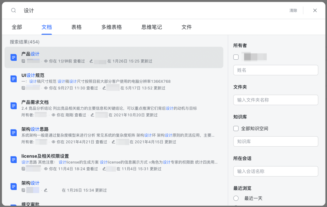 例如:在飛書文檔中,通過(guò)搜索關(guān)鍵詞后,分別展示該關(guān)鍵詞在文檔、表格、多維表格、思維筆記、文件五大類別中展示結(jié)果集,用戶通過(guò)類別區(qū)分,再縮小范圍尋找目標(biāo)值。