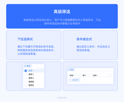 篩選條件自定義組合(靈活且占空間?。?。高級(jí)篩選占用空間比較小,用戶可以根據(jù)需要自定義篩選條件,不必將所有篩選條件都展示在界面中。使用更靈活,界面更美觀。
