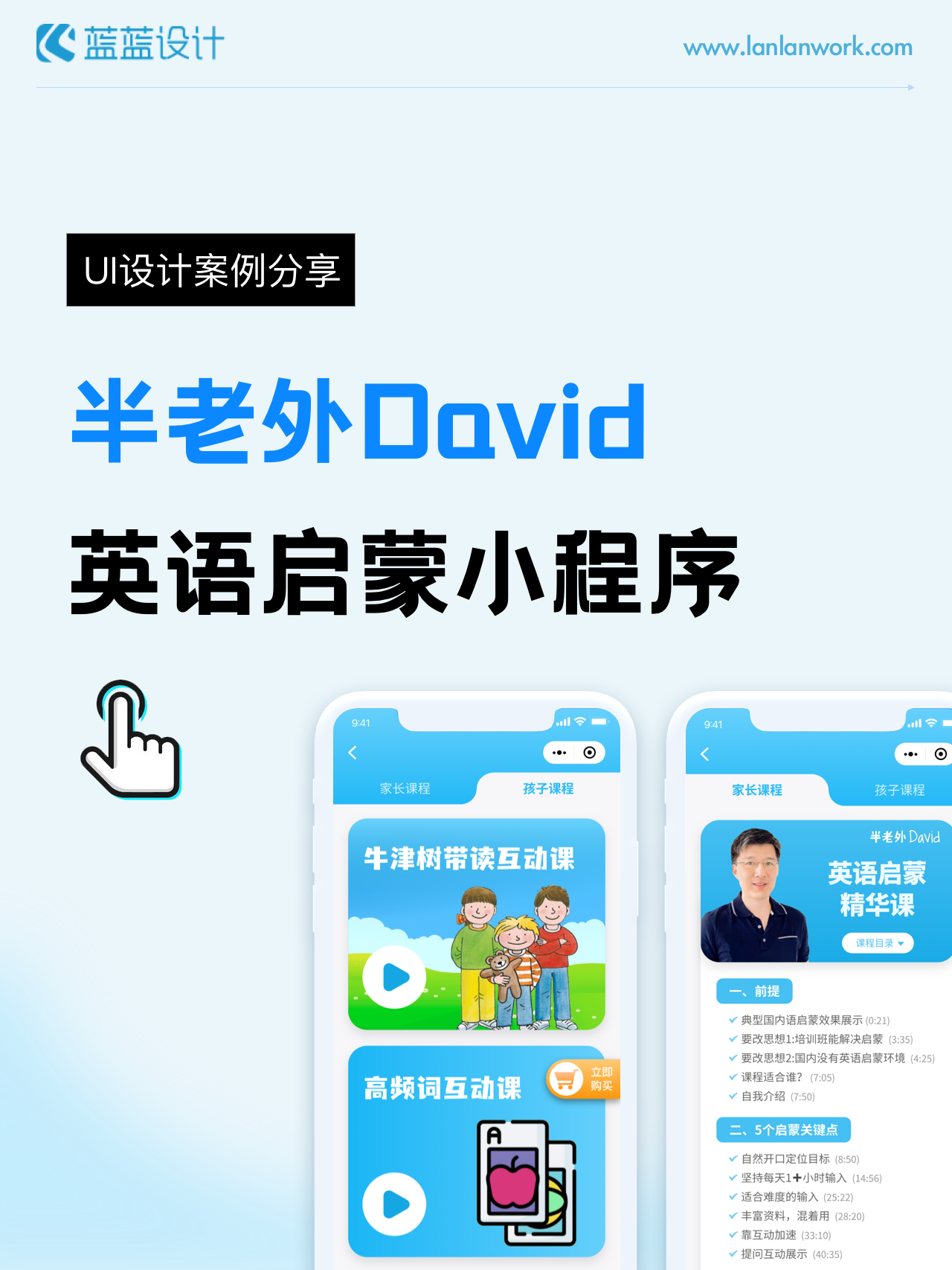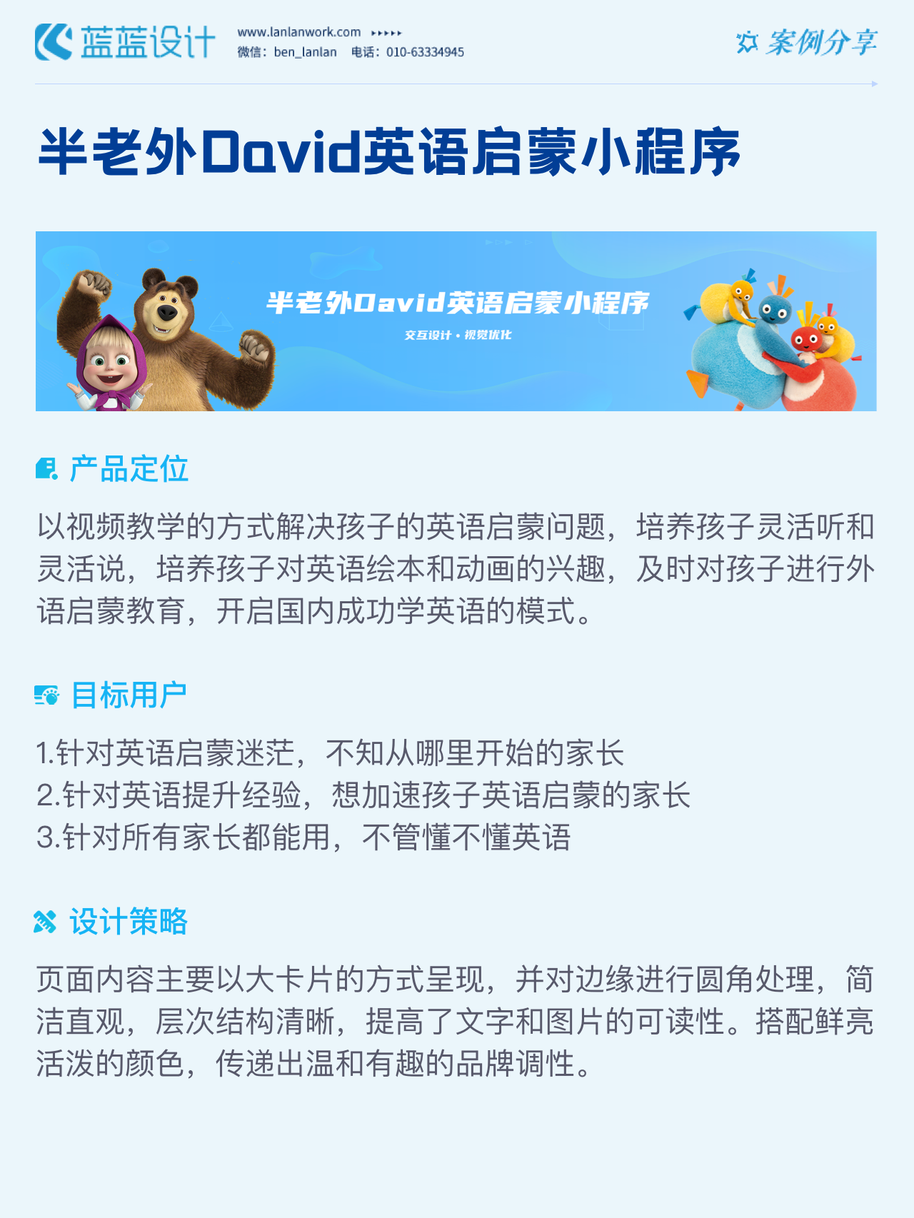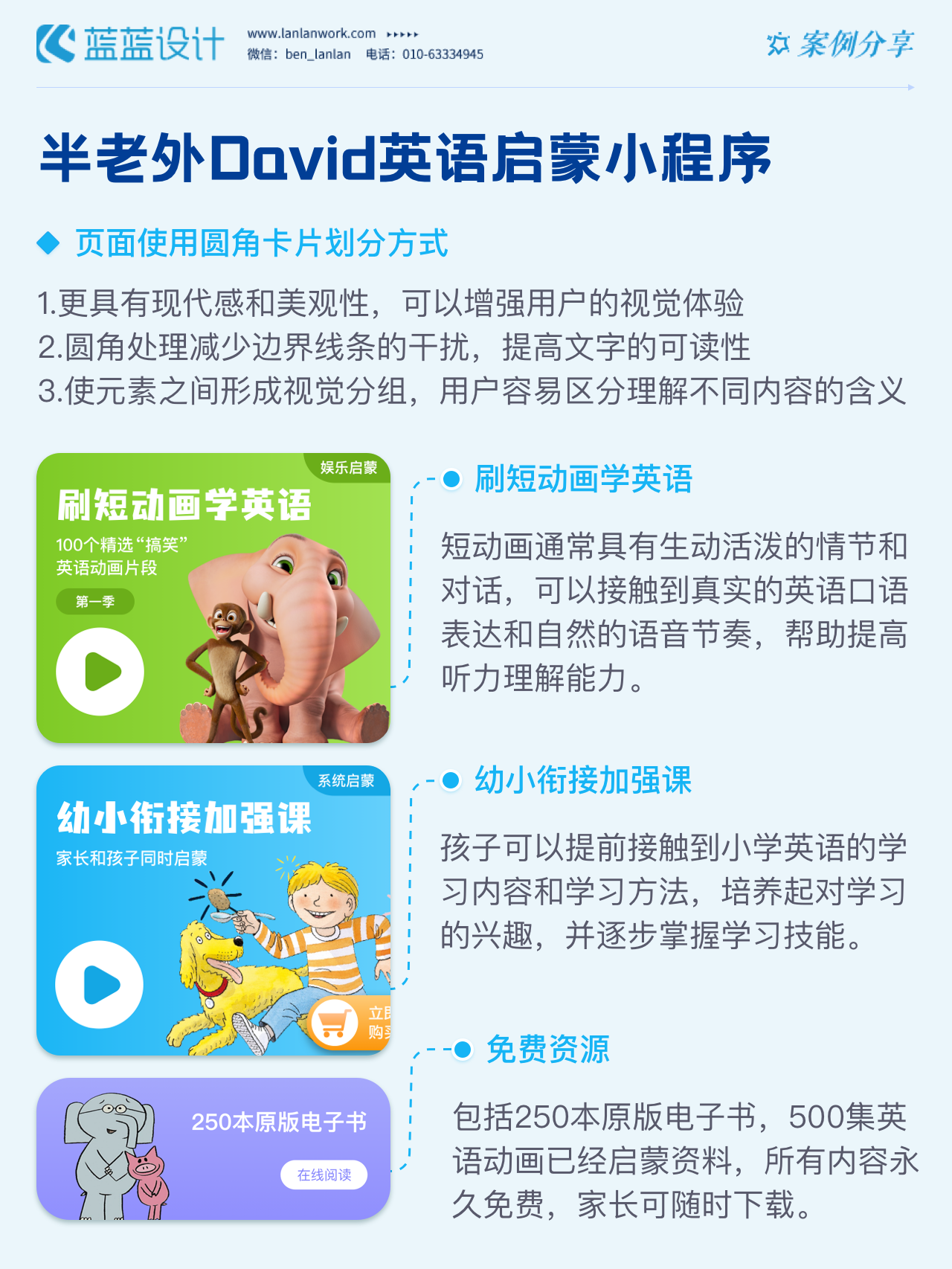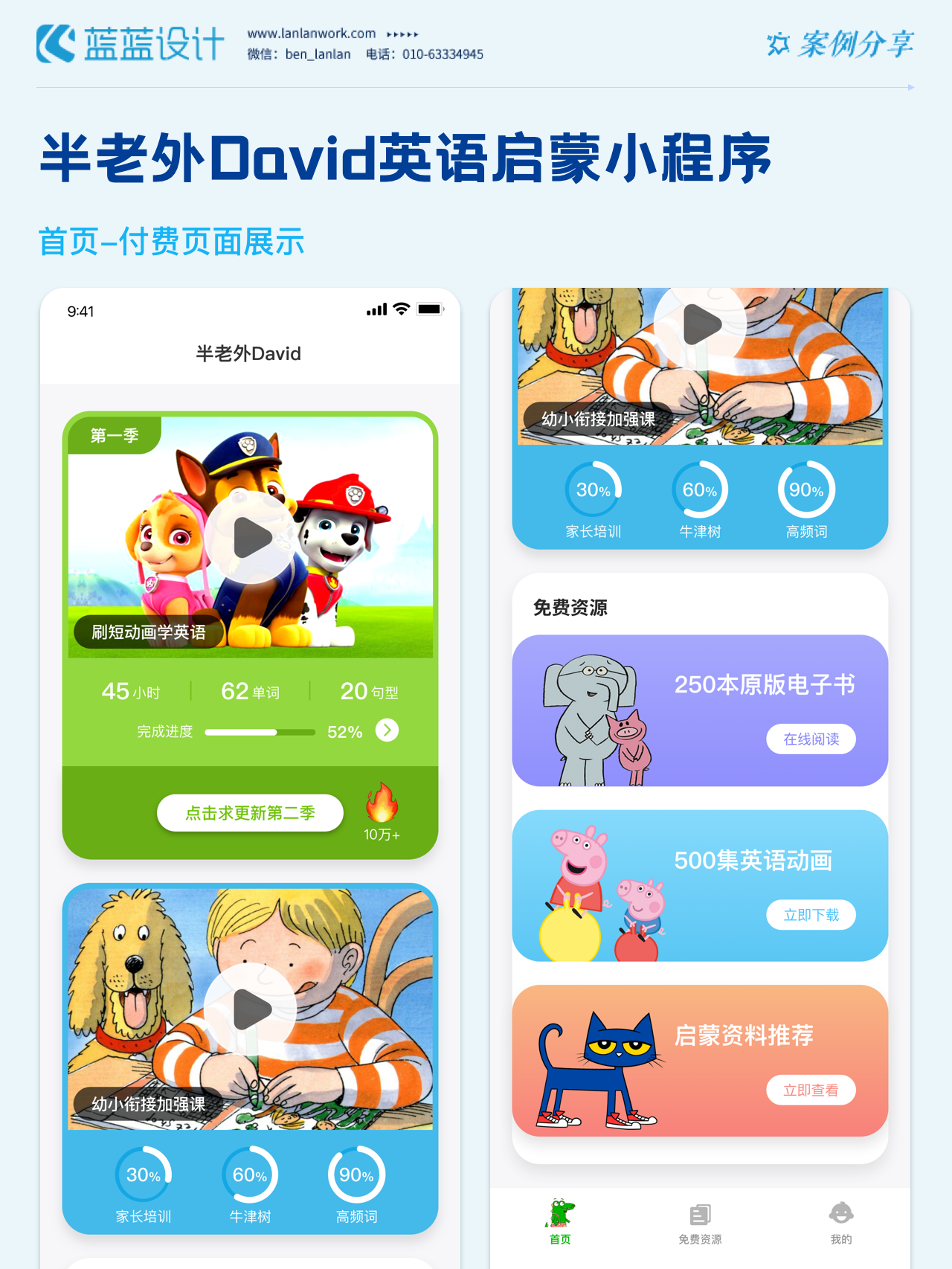 藍藍設計負責半老外David英語啟蒙小程序的界面整體風格和細節(jié)優(yōu)化工作,也包括圖片優(yōu)化等諸多視覺內(nèi)容。前期雙方通過不斷溝通和深入了解最終確定了頁面的風格樣式。看視頻學英語的方式更容易為孩子所接受,頁面的簡潔風格和顏色應用更加吸引兒童。