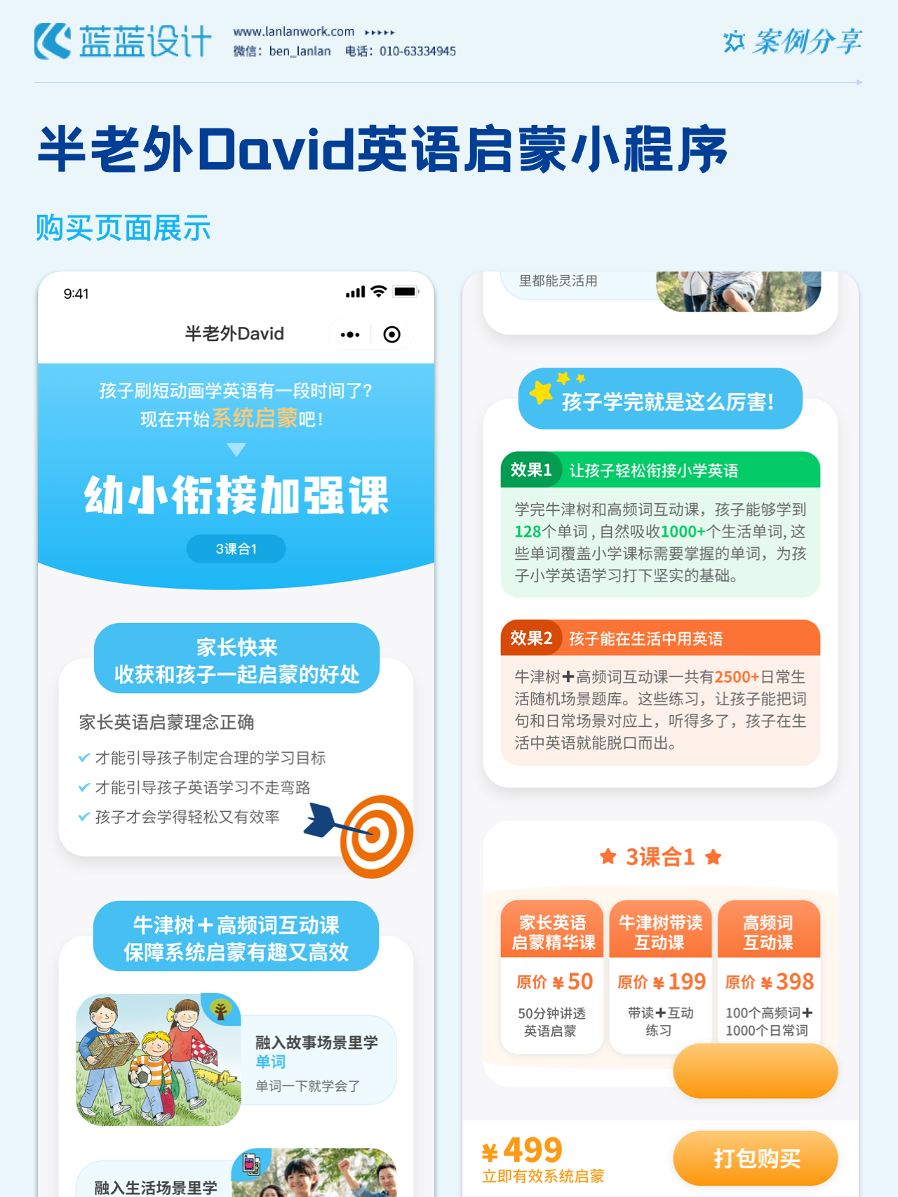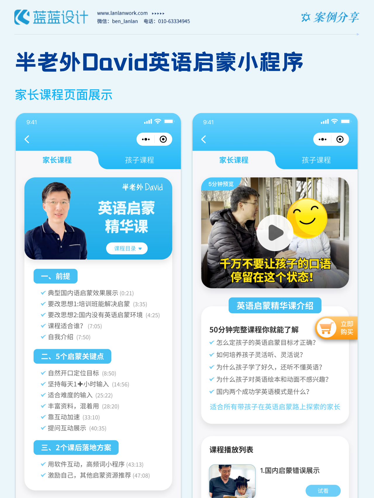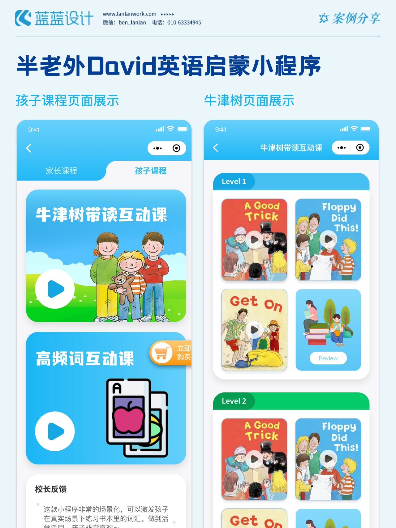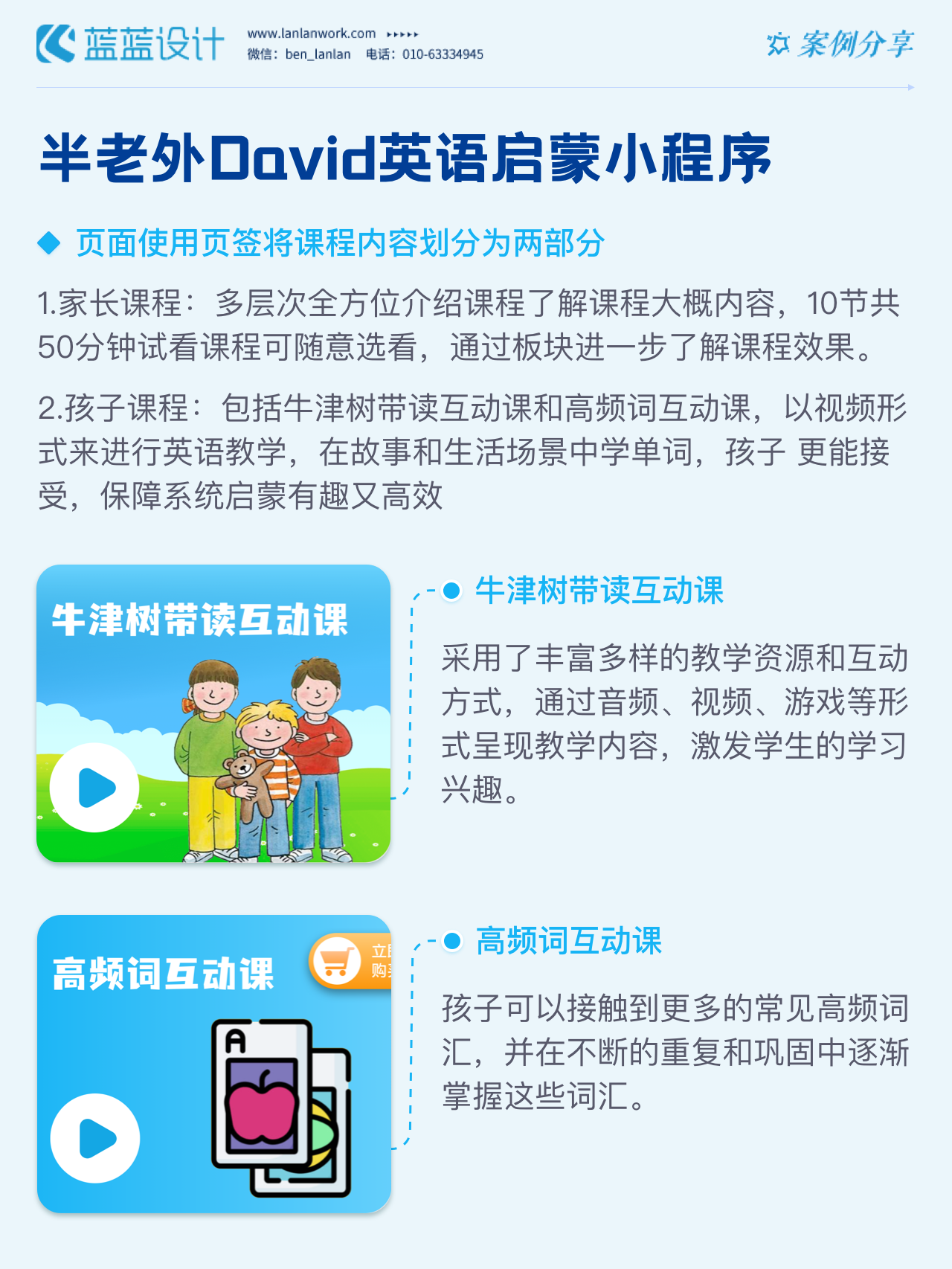 藍藍設計負責半老外David英語啟蒙小程序的界面整體風格和細節(jié)優(yōu)化工作,也包括圖片優(yōu)化等諸多視覺內(nèi)容。前期雙方通過不斷溝通和深入了解最終確定了頁面的風格樣式。看視頻學英語的方式更容易為孩子所接受,頁面的簡潔風格和顏色應用更加吸引兒童。