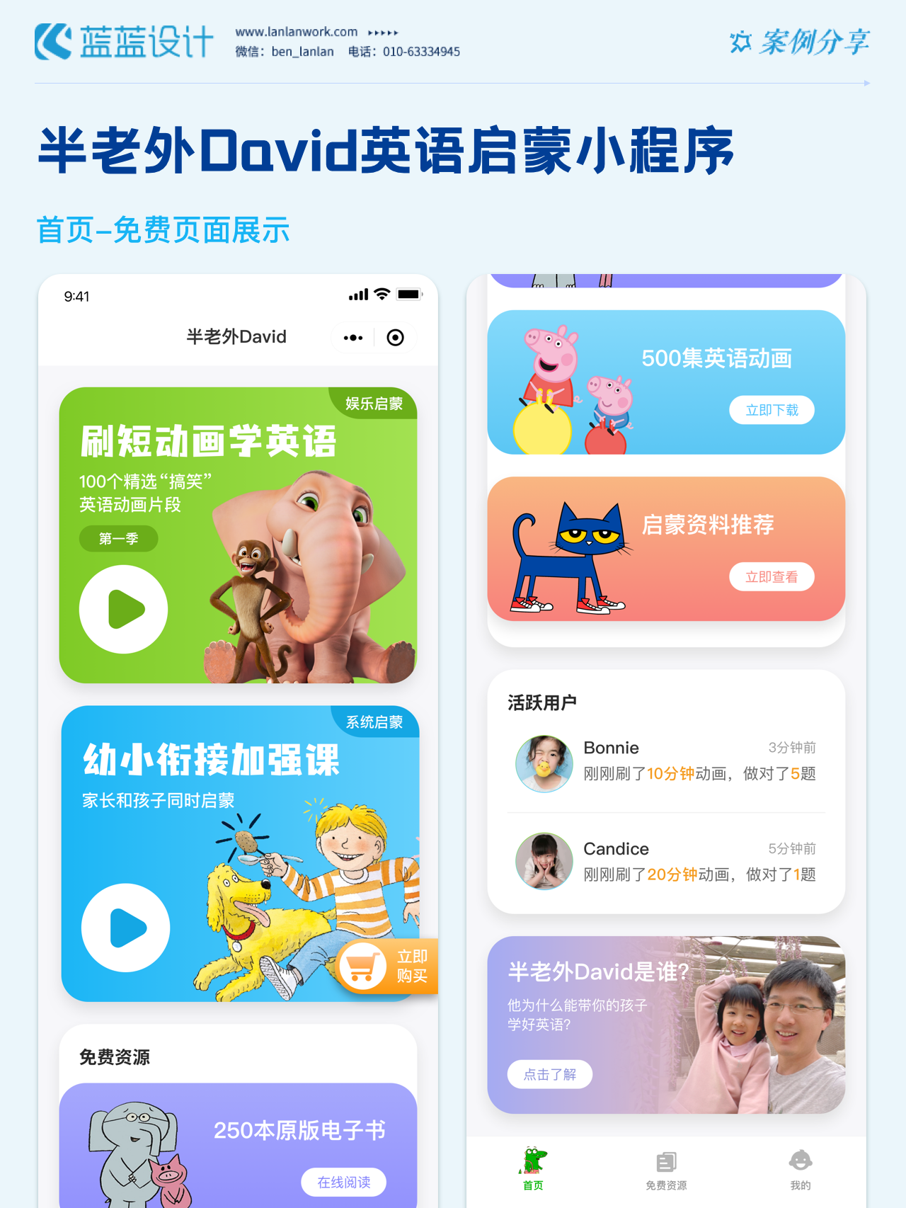 David是一個來自美國的華僑,哥大畢業(yè)后就來到了亞洲,現(xiàn)在定居北京!David是一個爸爸,也是一個創(chuàng)業(yè)者,在過去7年里都在科技教育領域創(chuàng)業(yè)。David相信,英語啟蒙能在家就能做好,于是推出線上英語啟蒙的小程序。