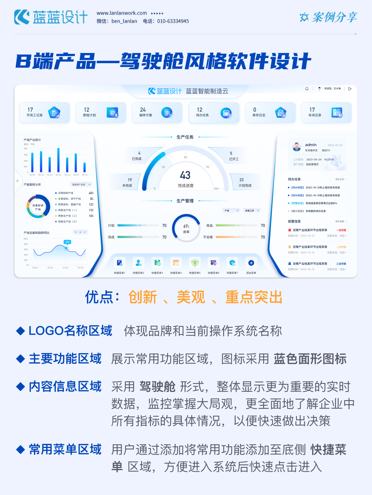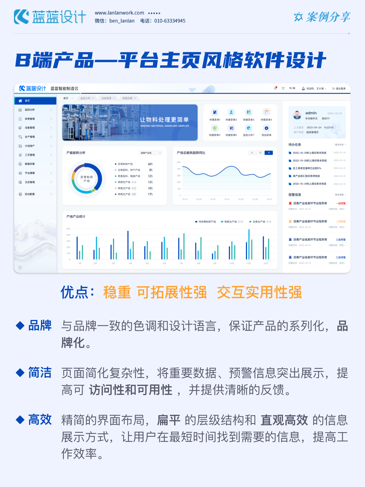 方案二:平臺(tái)主頁風(fēng)格 在初步調(diào)研產(chǎn)品框架的基礎(chǔ)上,系統(tǒng)首頁重構(gòu)信息組織架構(gòu),豐富信息和數(shù)據(jù),根據(jù)不同權(quán)限可調(diào)整頁面信息增加辦公效率。設(shè)計(jì)風(fēng)格采用簡(jiǎn)約的設(shè)計(jì)語言,模塊化布局,方圓并構(gòu)的設(shè)計(jì)模式,界面強(qiáng)調(diào)可復(fù)用性和通用性,配色采用品牌色,品牌融合度高。