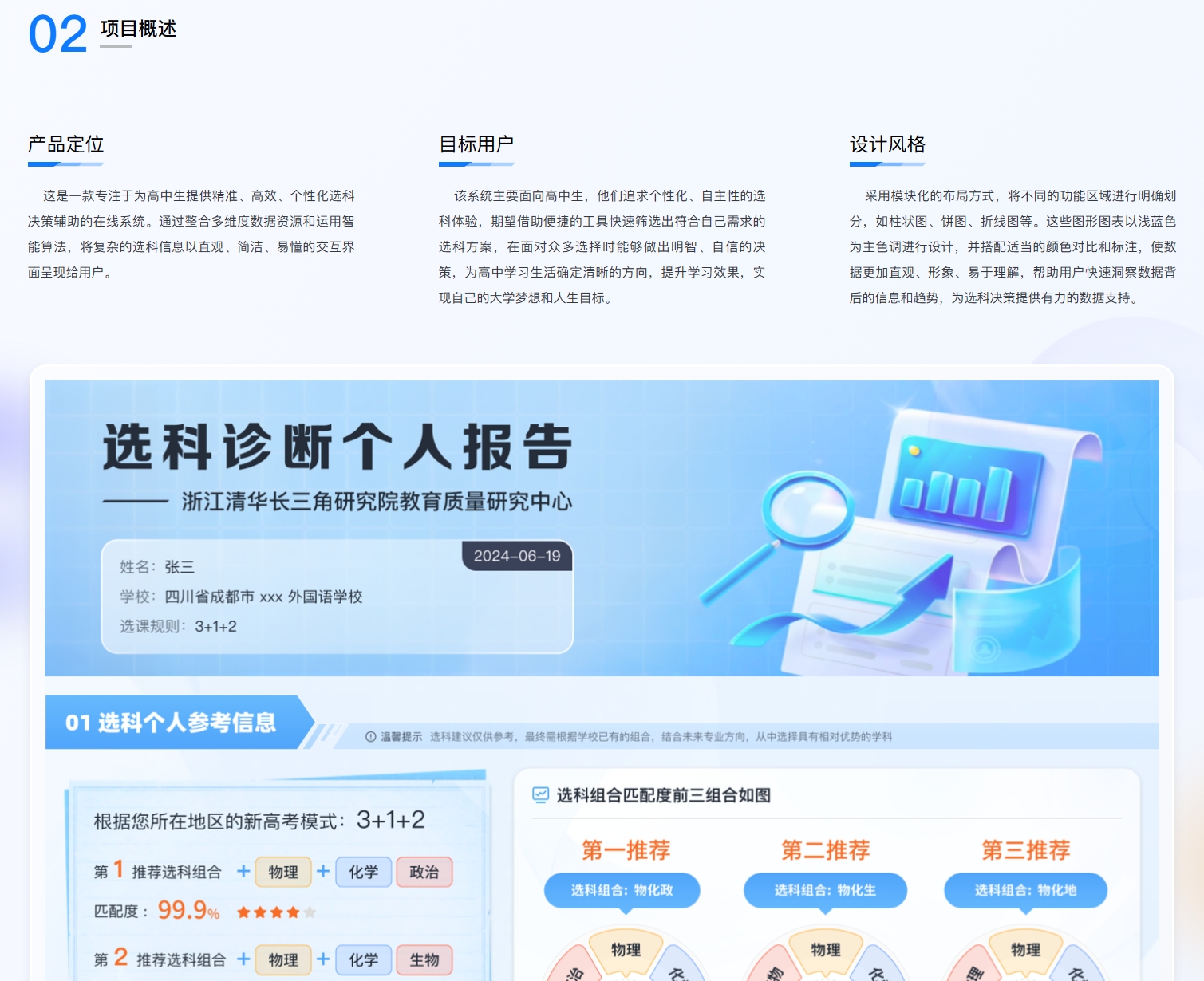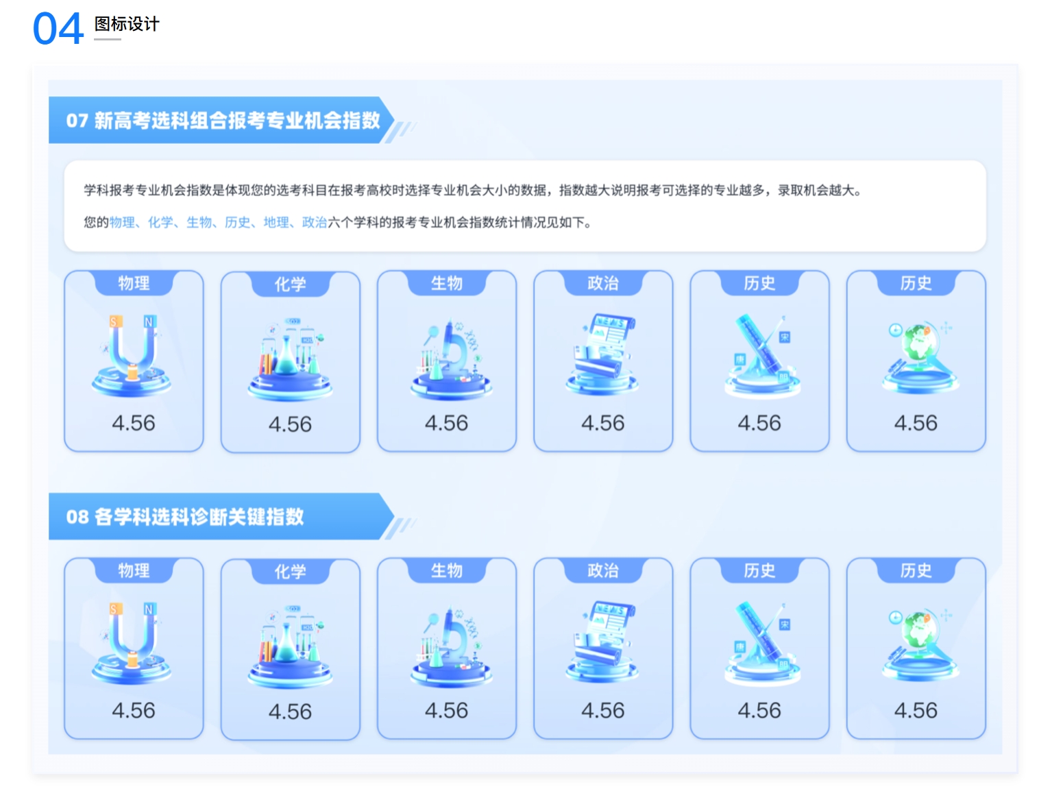 在「3+3」「3+1+2」新高考模式下,選科決策成為高中生和家長(zhǎng)的「頭等大事」。蘭亭妙微公司受委托優(yōu)化高考選科決策平臺(tái)個(gè)人診斷報(bào)告界面,核心挑戰(zhàn)是:如何將復(fù)雜的測(cè)評(píng)數(shù)據(jù)(如學(xué)習(xí)能力傾向、學(xué)科報(bào)考機(jī)會(huì)、職業(yè)興趣等)轉(zhuǎn)化為直觀易懂、兼具美感的視覺(jué)語(yǔ)言?