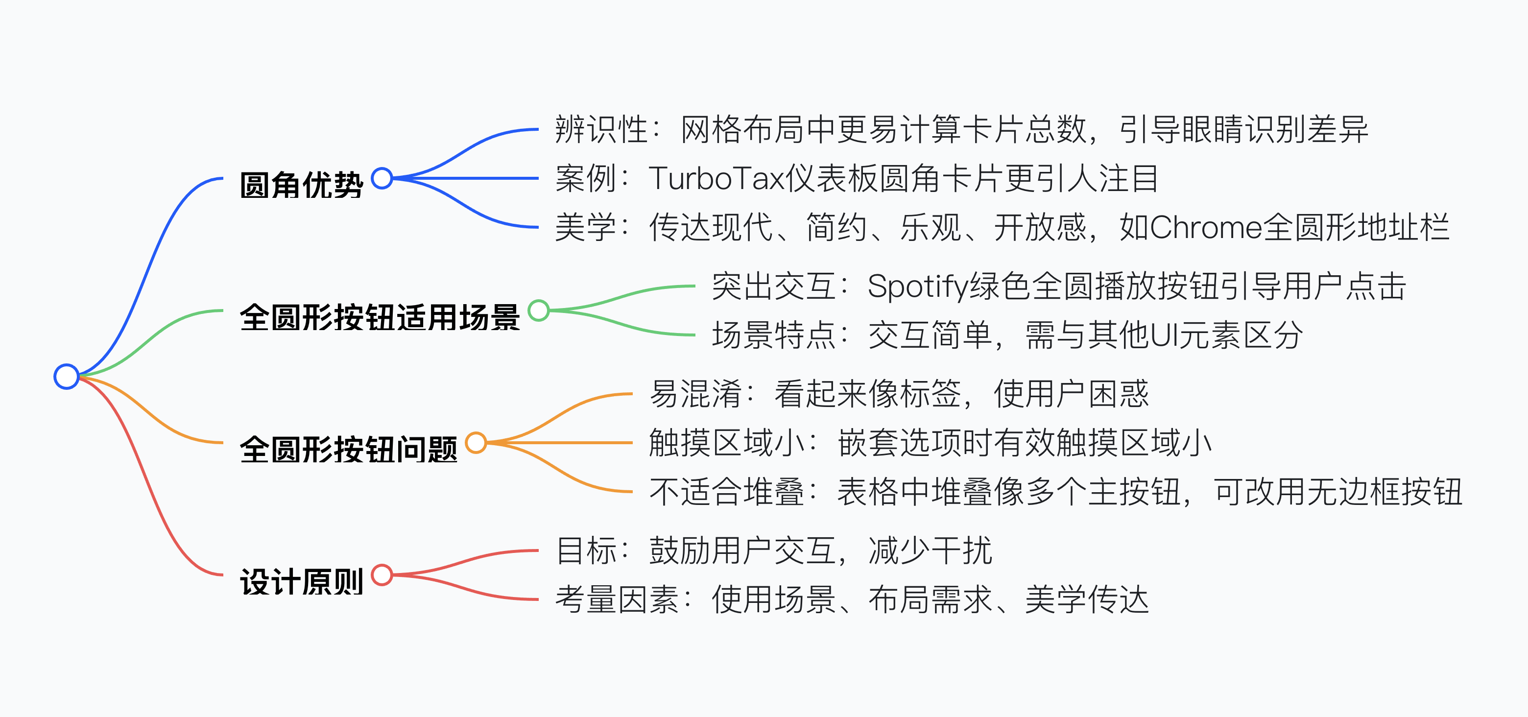 UI 設(shè)計中按鈕用圓角還是直角需綜合考量,圓角在網(wǎng)格布局中更易辨識,如 TurboTax 儀表板中圓角卡片比尖角更引人注目,全圓形按鈕在 Spotify 中因突出交互引導(dǎo)成功,但全圓形按鈕可能被誤認(rèn)標(biāo)簽、嵌套選項觸摸區(qū)域小、不適合堆疊,而直角按鈕在表格等堆疊布局中更合適,此外圓角傳達(dá)現(xiàn)代、簡約等感覺,像 Chrome 瀏覽器更新為全圓形地址欄,總之設(shè)計需以鼓勵用戶交互、減少干擾為目標(biāo),而非單純選擇圓角或直角。