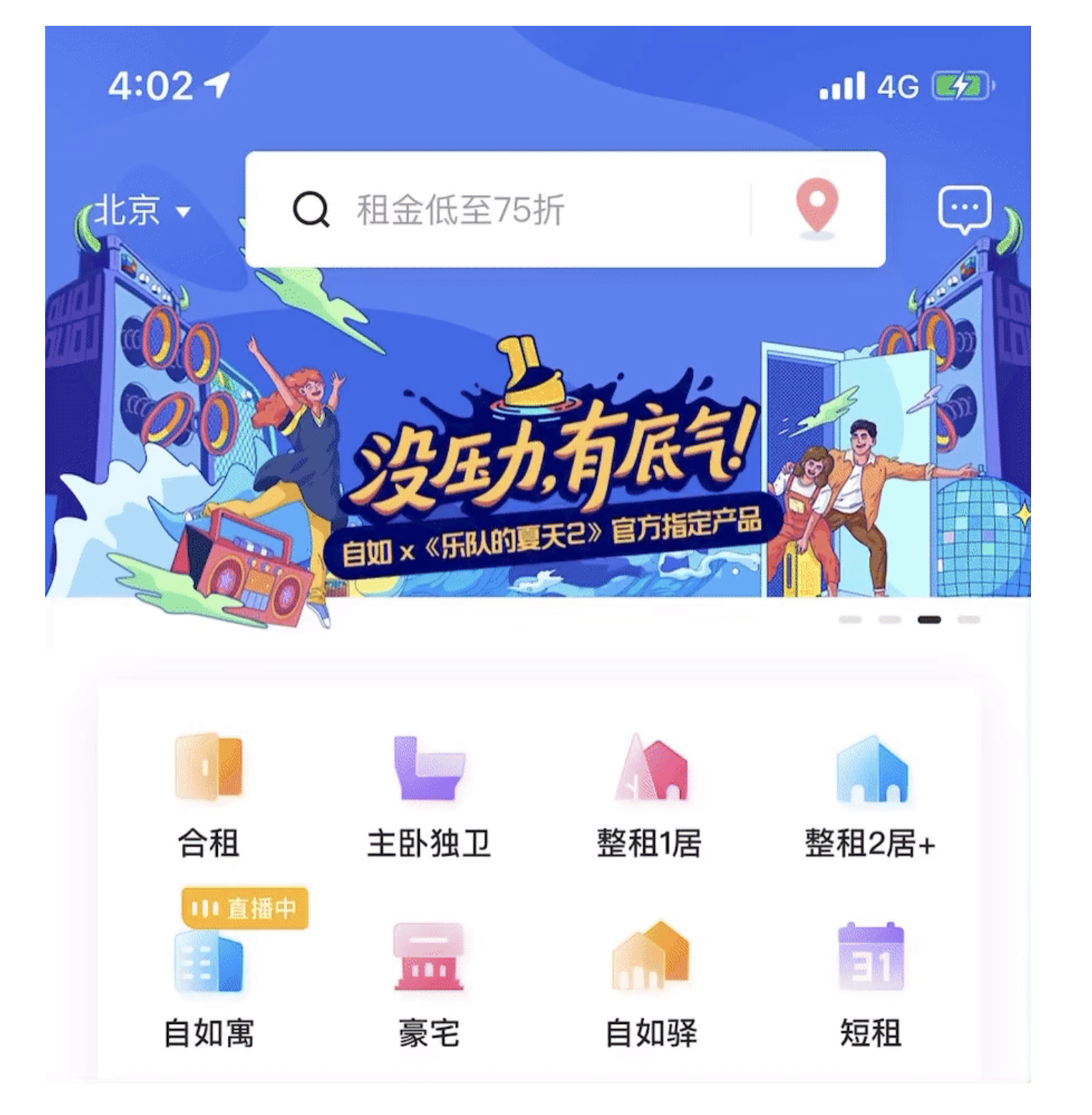 通欄 Banner 是首屏的 “常客”—— 它占據(jù)整個頁面寬度,視覺沖擊力強,適合傳遞單一、重要的信息,比如產(chǎn)品的年度活動、核心功能更新。以自如的首頁 Banner 為例,通欄設(shè)計搭配 “租金低至 75 折” 的大標(biāo)題,配合分層視覺效果,瞬間抓住用戶對 “優(yōu)惠” 的注意力;再如工具類 APP 的 “版本更新” Banner,通欄布局讓 “立即升級” 的入口更突出,降低用戶操作成本。