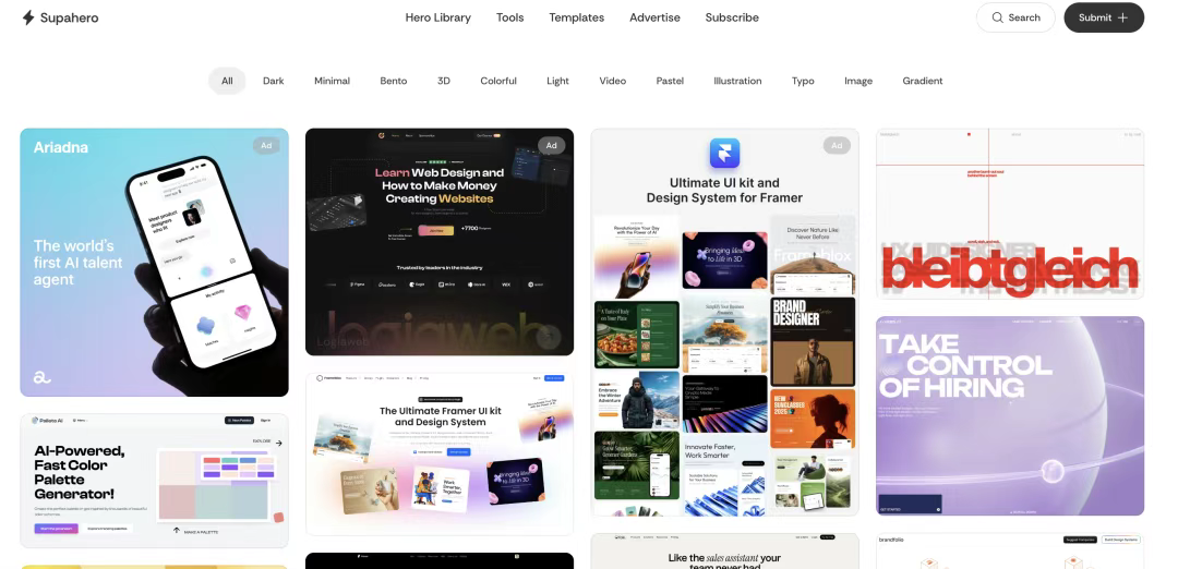 [Supahero](http://supahero.io) 專(zhuān)注于網(wǎng)站最重要的部分之一——英雄區(qū)(Hero Section)設(shè)計(jì)。這個(gè)區(qū)域通常是訪問(wèn)者首先看到的部分,對(duì)于吸引用戶(hù)注意力至關(guān)重要。