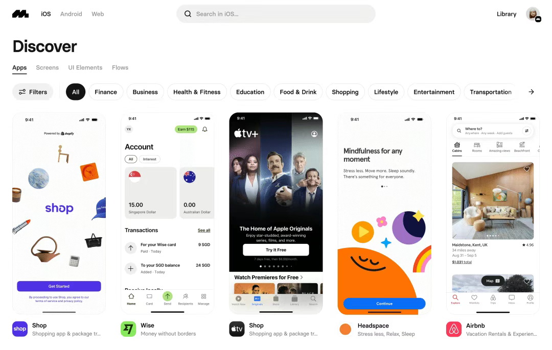 [Mobbin](http://mobbin.com) 是目前最大的UI/UX設(shè)計(jì)參考庫(kù)之一,提供了大量的移動(dòng)應(yīng)用和網(wǎng)站界面設(shè)計(jì)案例。與其他平臺(tái)不同,Mobbin 不僅展示首頁(yè)設(shè)計(jì),還提供完整的用戶(hù)流程和交互設(shè)計(jì)參考。