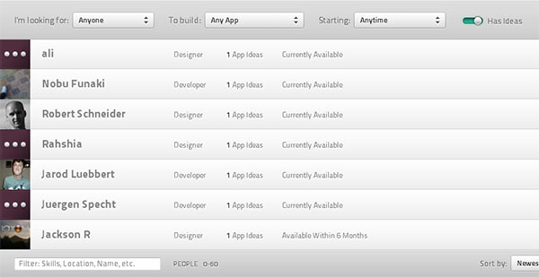 當有大量數據要處理的時候過濾就很有用。使用下拉列表,單選按鈕或者復選框進行過濾選擇。 在下面的例子里, builditwith.me使用下拉列表來對用戶的職業(yè)興趣和當前狀態(tài)進行過濾。
