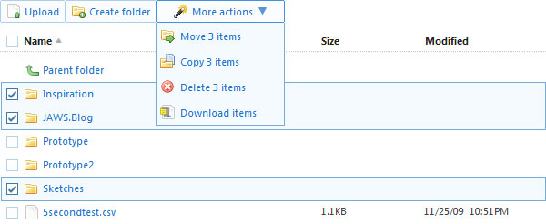 這種方式可以很好地讓用戶批量完成多行的操作。選中每一行前面的復選框,點擊批量操作鏈接或按鈕,用戶可以選中多行進行操作。還是以DropBox為例,用戶可以選中多條文件,點擊菜單進行批量操作。