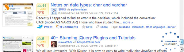 與分頁相反,連續(xù)滾動是一種新型的數據顯示方式。這種方式不需要選擇特定的數據類型,新的數據被加到列表里。在加載的時候顯示進度,如下例所示,在dzone.com里,進度條顯示有多少項已經被加載。