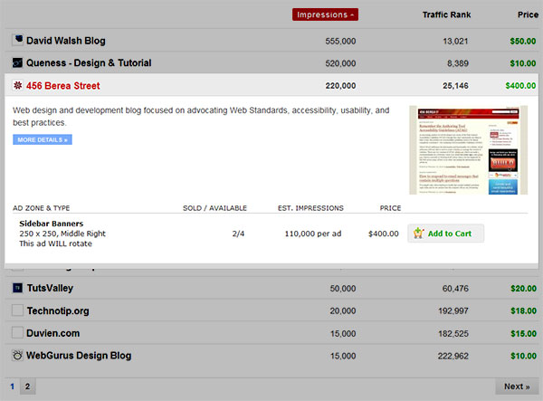 關于這種模式我寫過一篇文章,也建了一個可以輕松實現(xiàn)的jQuery小插件。 這種模式的關鍵點就是可以給表格增加更多相關信息功能。以BuySellAds為例,展開行顯示了出版商的廣告詳細信息,同時始終顯示主行里的重要信息。