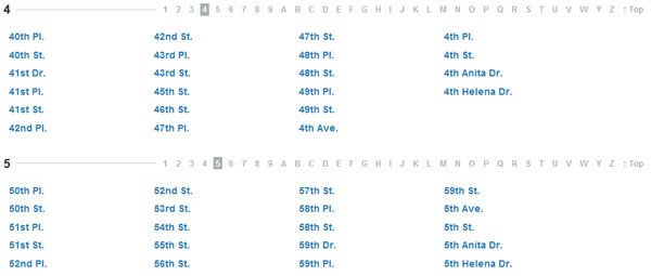 Product Planner 采用了標準的分頁顯示,有頁碼數字,有上一頁下一頁。但是,你能告訴我第2頁是什么? 第3頁?當然你不能。不用擔心,標準分頁可以得到改善。如下所示,通訊錄很龐大,他們使用了數字和字母來分頁。在這個例子里顯示所有的頁和隱藏頁一樣好。你可以以此類推應用到其他條件相似的表格。如果表格以日期來分類,你可以以日期范圍來替代傳統(tǒng)的分頁數字(如第1頁可以寫成2.10-2.12,等等)