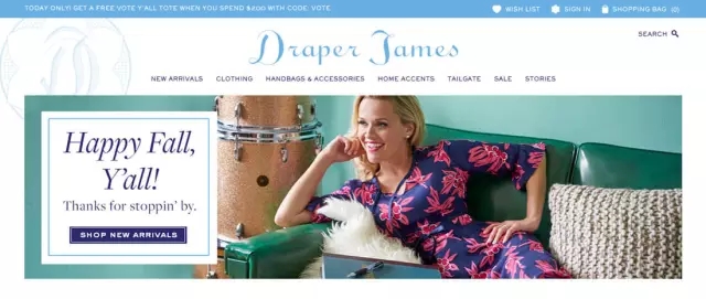 看看 Draper James 的服裝網(wǎng)站吧。首頁大圖中最吸引人的大概是妹子臉上的微笑吧?明亮的色彩給用戶愉悅的體驗(yàn),而隨后的文案內(nèi)容“Happy Fall,Y’all”它將秋季的愉悅情緒毫不掩飾地表露出來,用戶在這個(gè)時(shí)候可以直接地體會(huì)到設(shè)計(jì)師的情感。當(dāng)然,這樣的設(shè)計(jì)針對(duì)性很明顯,有一部分用戶可能會(huì)因此離開,但是你需要針對(duì)這個(gè)進(jìn)行判斷。