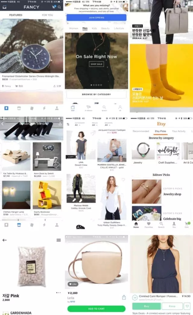 接下來我們就需要對這些 apps 進行視覺風格上的拆分,來看看到底是哪些視覺表現(xiàn)讓大家覺得它們是時尚、簡潔的。我們可以依據(jù)經(jīng)驗對視覺表現(xiàn)劃分幾個維度(比如以下幾個),接下來我將以購物應用為例,從以上幾個維度來示意分析的方法。