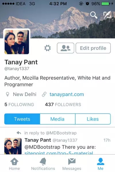 案例學(xué)習(xí):Twitter上的切換鍵被放在屏幕的端。這幫助用戶更加快速的觸碰相關(guān)鍵如主頁(yè)(Home)、通知(Notifications)、消息(Messages)、我(Me)以進(jìn)入軟件的各個(gè)部分。他們?cè)?jīng)將按鍵放在了最頂端,然而這增加了大屏用戶使用難度。