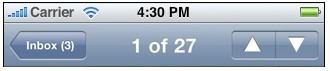在iPhone 平臺上,如果應用程序有信息層級關系(比如郵箱> 收件箱> 郵件),利用title 進行導航, 導航欄左側始終是返回按鈕,右側如果有必要,可以放針對內容的操作控件,中間有標題。