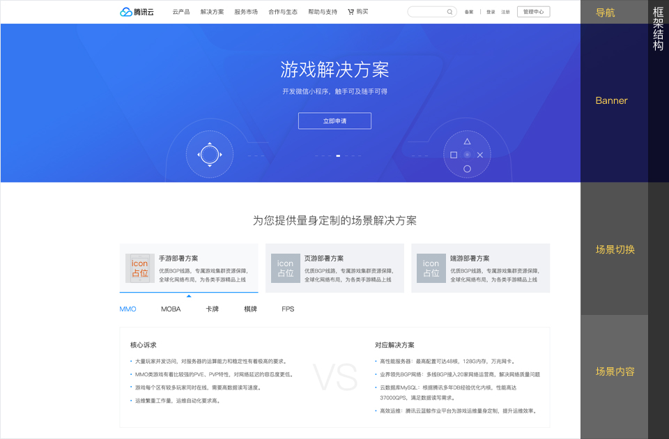 (如下圖所示為常見網(wǎng)頁形態(tài)結(jié)構(gòu),整個(gè)頁面UI開發(fā)同學(xué)需要得到的其實(shí)是設(shè)計(jì)師確認(rèn)的框架結(jié)構(gòu),至于里面的圖標(biāo)、banner配圖、抑或是文字內(nèi)容都是可以后面提供的。具體來說,如下圖中,場(chǎng)景切換部分為三分陣列版式,灰色方框?yàn)閳D標(biāo)占位預(yù)留,UI開發(fā)同學(xué)只需要圖標(biāo)占位尺寸即可,圖標(biāo)細(xì)節(jié)和形態(tài),設(shè)計(jì)師在后面完成整體頁面框架后-上線前補(bǔ)齊即可。)