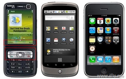 在底部的幾個按鍵的處理上(返回、菜單、home  、搜索),Android  的做法似乎介于傳統(tǒng)手機(jī)和iPhone  兩者之間,既保留了傳統(tǒng)手機(jī)的一些特性,但也在學(xué)習(xí)iPhone  的觸屏做法。  從蘋果遵循極簡的設(shè)計思路來看,  iPhone   做得更徹底、更加一 些。