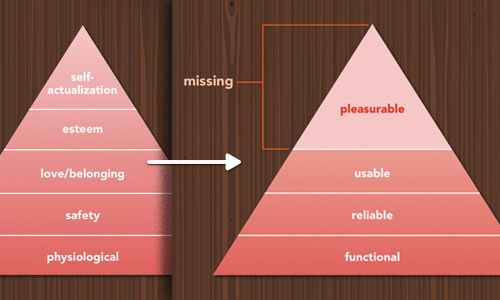 “情感化設(shè)計(Emotional Design)”一詞由Donald Norman在其同名著作 當(dāng)中提出。而在Designing for Emotion 一書中,作者Aarron Walter將情感化設(shè)計與馬斯洛的人類需求層次理論聯(lián)系了起來。正如人類的生理、安全、愛與歸屬、自尊和自我實現(xiàn)這五個層次的需求,產(chǎn)品特質(zhì)也可以被劃分為功能性、可依賴性、可用性和愉悅性這四個從低到高的層面,而情感化設(shè)計則處于其中最上層的“愉悅性”層面當(dāng)中。