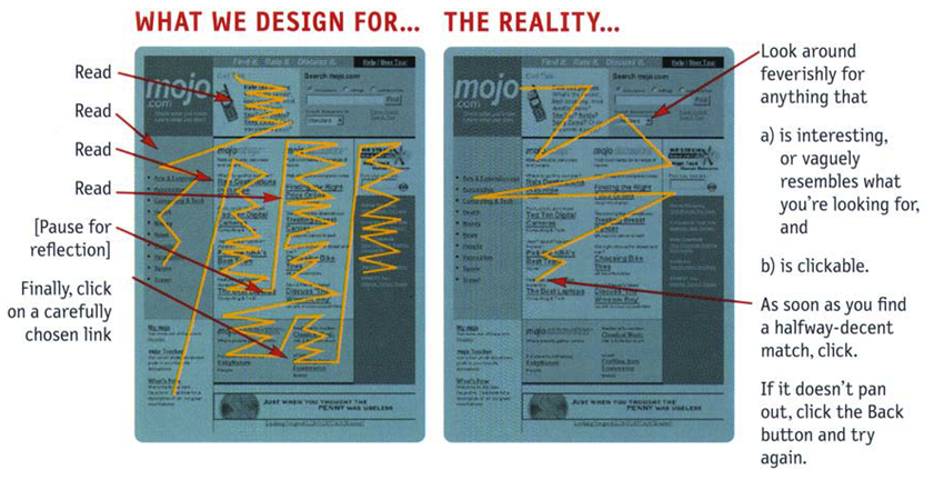 左側(cè)是設(shè)計師期望用戶的瀏覽方式,右側(cè)為用戶實際的瀏覽方式—摘自《Don’t make me think》