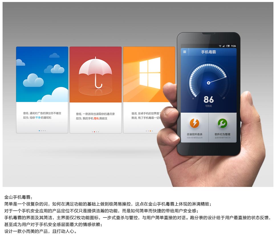 2 唯美、色彩強(qiáng)彩、簡(jiǎn)約與精致用到極好的一款手機(jī)設(shè)計(jì)。原素及布局簡(jiǎn)單、圖標(biāo)造型簡(jiǎn)單中蘊(yùn)含豐富變化,給人豐富的想象力!愉悅的視覺(jué)享受!配以個(gè)人化、動(dòng)情的文案,典型的情感化設(shè)計(jì)??!