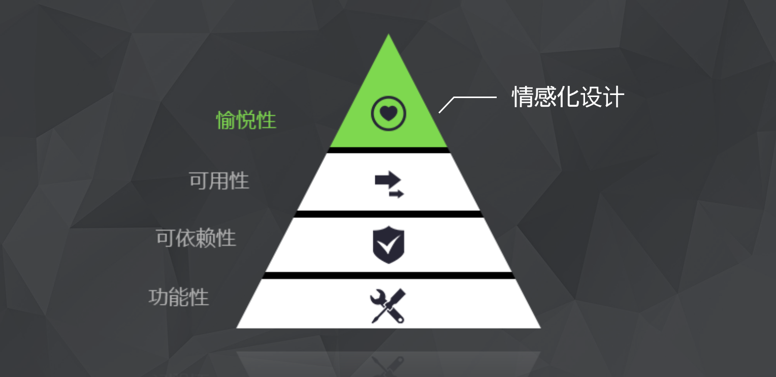 《情感化設(shè)計心理學(xué)中》作者唐納德·諾曼將情感化設(shè)計與馬斯洛的人類需求層次理論聯(lián)系了起來 產(chǎn)品特質(zhì)也可以被劃分為功能性、可依賴性、可用性和愉悅性這四個從低到高的層面,而情感化設(shè)計則處于其中最上層的“愉悅性”層面當(dāng)中。