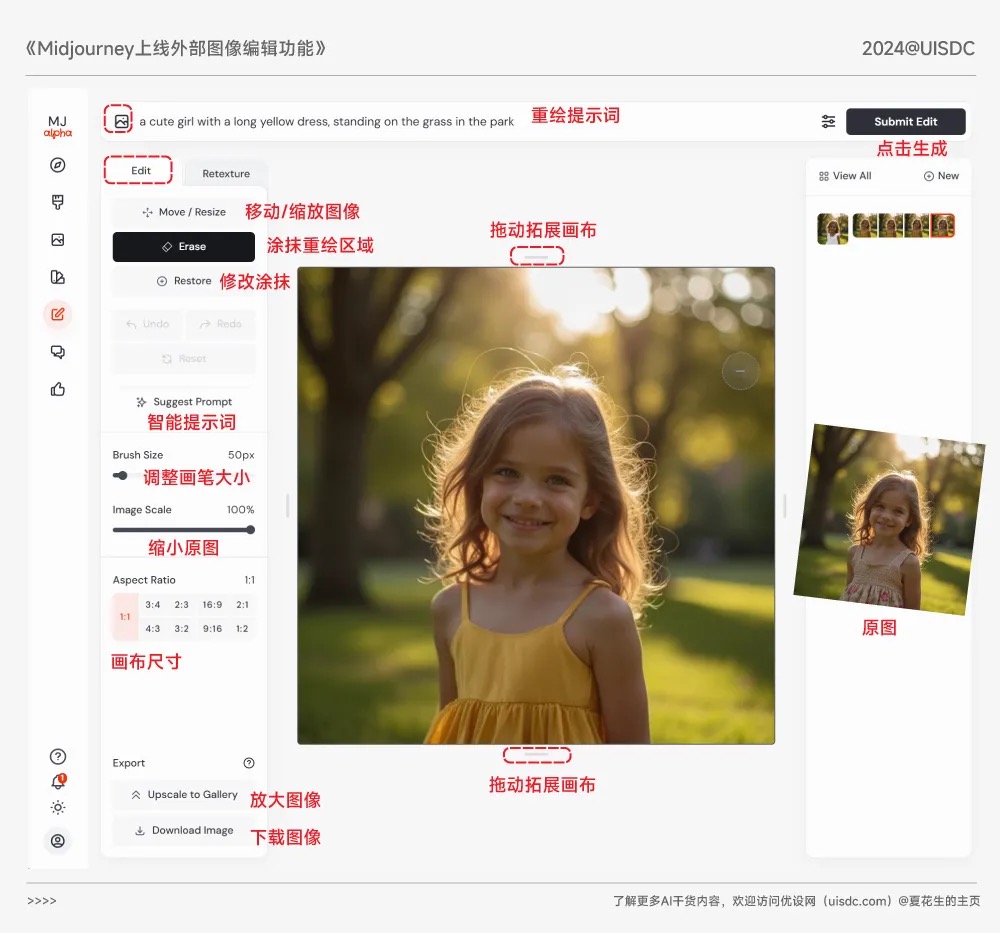 Edit(編輯)功能:支持局部重繪和外繪擴(kuò)展??梢酝磕ㄐ枰乩L的區(qū)域,并輸入提示詞進(jìn)行編輯。支持連續(xù)多次編輯,提高工作效率。