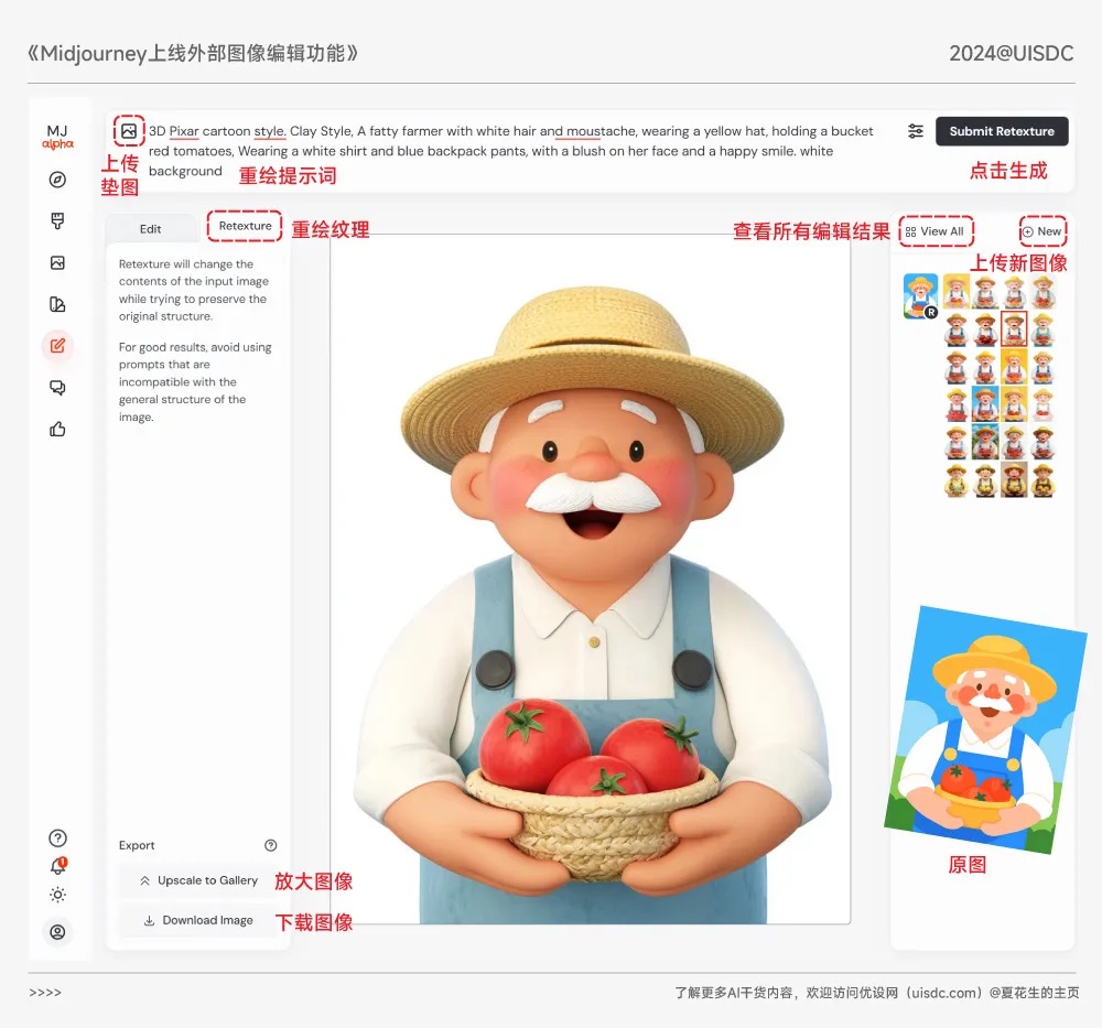 Retexture(重繪)功能:類似于Controlnet的深度控制功能,保留原始結(jié)構(gòu),根據(jù)提示詞重新繪制畫面??梢愿淖冿L(fēng)格、材質(zhì)等,如將2D插畫轉(zhuǎn)換為3D風(fēng)格。應(yīng)用場景包括2D轉(zhuǎn)3D、線稿轉(zhuǎn)實(shí)物圖、線稿上色等。