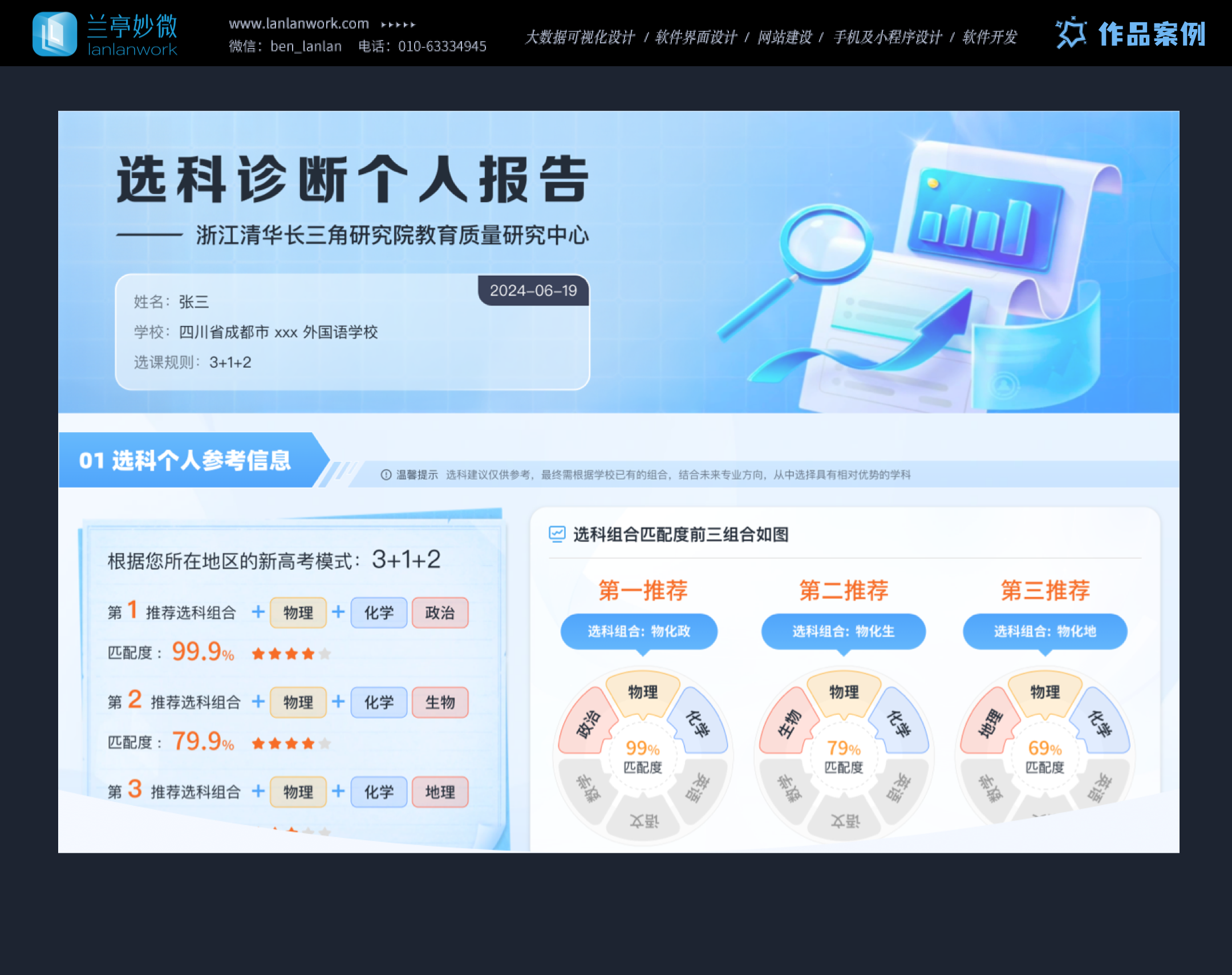 采用模塊化的布局方式,將不同的功能區(qū)域進(jìn)行明確劃分,如柱狀圖、餅圖、折線圖等。這些圖形圖表以淺藍(lán)色為主色調(diào)進(jìn)行設(shè)計(jì),并搭配適當(dāng)?shù)念伾珜?duì)比和標(biāo)注,使數(shù)據(jù)更加直觀、形象、易于理解,幫助用戶快速洞察數(shù)據(jù)背后的信息和趨勢(shì),為選科決策提供有力的數(shù)據(jù)支持。
