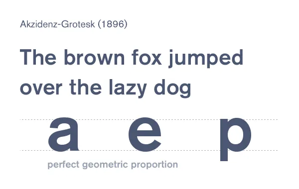 Akzidenz-Grotesk 起于1896年,受到很多字體的影響,從Baskerville, Garamond和Carlson中繼承了幾何比例的影響,將其發(fā)展到了新的一級。當代的Akzidenz-Grotesk字體遺傳于20世紀50年代后期,它已經(jīng)是被擴大后的字體族,這些風格到后來啟發(fā)了更加現(xiàn)代的Helvetica,和Univers。