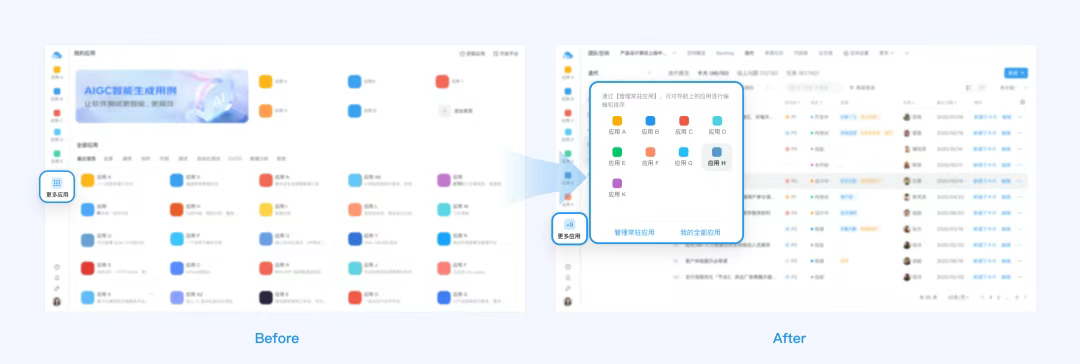 鼠標懸浮時,它就像一個傳送門一樣將用戶需要切換的應用呈現(xiàn)在浮層卡片上,用戶點擊所需的應用即可完成應用的切換。