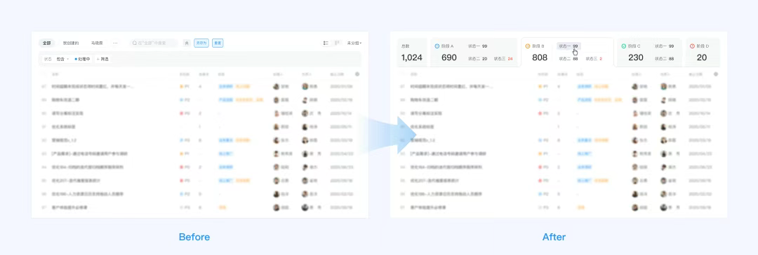 我們最初使用了數(shù)據(jù)可視化的看板來呈現(xiàn)各階段下不同狀態(tài)的概覽信息,但這只解決了數(shù)據(jù)概覽的問題,用戶還是需要點擊“詳情”才能跳轉(zhuǎn)至相應的頁面。