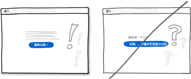 你可以通過不確定而顫抖的聲音來表達傳遞自己的意思,當然也可以通過很自信的方式表達。如果你在界面中的表述用語多以問號結(jié)束,比如"也許","可能","感興趣?" 或者"想要試試么?",那么你完全還可以把語氣變得更堅定一些。不過萬事無絕對,或許適當放松措詞讓用戶有自行思考的余地也是可以的。