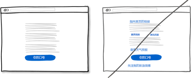 為了滿足各式用戶的需求,在頁面上放些鏈接鏈到這里鏈到那里是常見的做法。如果你的主要目的是想讓用戶點擊頁面最后那個下載按扭什么的話,就需要三思了。因為用戶可能點擊了其他鏈接離開頁面了。所以你需要注意頁面的鏈接數(shù)量,最好將用于導航與用于操作的鏈接用樣式區(qū)分開。盡量移除頁面不需要的鏈接會讓用戶點擊到你的功能按鈕。