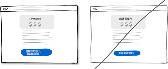 試想界面上有這樣兩個按鈕:一個是"獲取折扣",另一個是"立即注冊"。我敢打賭大多數(shù)人會點擊第一個,因為第二個按扭讓人感覺不到有利可圖,并且"注冊"讓人聯(lián)想到填不完的表單。也就是說讓用戶感受到獲利的按鈕更有可能被點擊。這種讓用戶感到好處的文字信息也可放在按鈕旁邊,不一定要做為按鈕的標題。當然,正常的按鈕還是有用處的,一般用于重復性操作頻繁的地方。