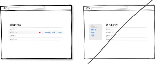 不用說直接在元素身上進行操作是更直觀明了的方式。比如在一個列表中,我們想讓用戶對每個條目進行操作那么就把按鈕放到當前條目上,而不要把放到列表之外。再比如就是直接點擊元素就進入編輯狀態(tài)(比如頁面上的地址信息點擊后可以進行編輯)。這種方式比傳統(tǒng)的選中再點擊相應的按鈕進行操作要簡潔省事得多。當然,對于一般性的操作本身就不需要有什么上下文的,就沒必要這么做了,比如頁面上的前進,后退按扭。
