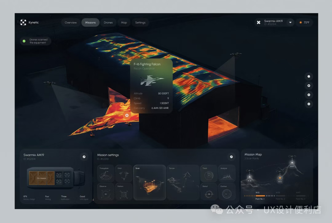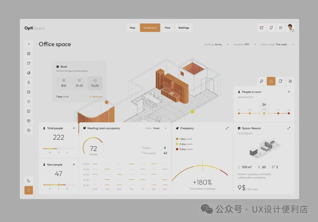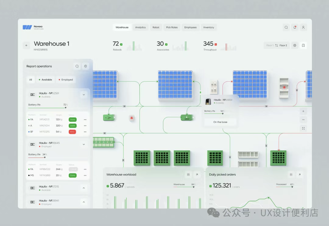 一直以來復雜的工業(yè)頁面或者dashboard,都會采用比較簡潔的UI效果,很少會增加一些質(zhì)感。畢竟這類頁面的設計重點是突出信息。但是來自RonDesignLab 的設計,給我們打開了新的思路。
