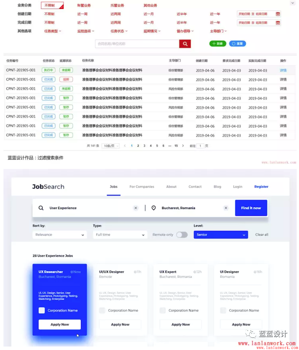 大多數(shù)表格的前面都有搜索過濾功能,如果搜索條件相當(dāng)多,可以精選一部分主要的排成一行,其他的隱藏,點(diǎn)箭頭再出現(xiàn)。整個搜索區(qū)域也可以有隱藏/顯示的按鈕,來給下面的表格更多的空間。